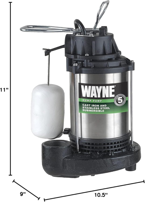 The Wayne CDU980E submersible sump pump can move up to 4600 gallons per hour (gph). The top suction design filters debris and minimizes clogging. It is a rugged, stainless steel and cast iron submersible sump pump. This pump is designed for 11-Inch diameter and larger sump pits.Intended for indoor use only.
