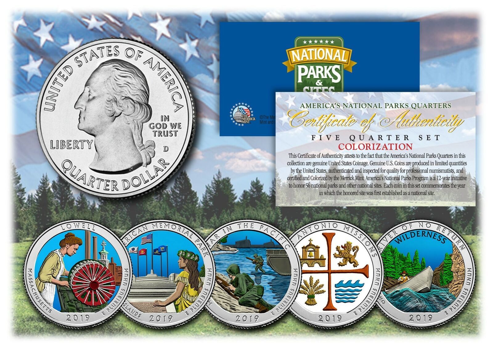2019 America The Beautiful COLORIZED Quarters U.S. Parks 5-Coin Set w/ Capsules