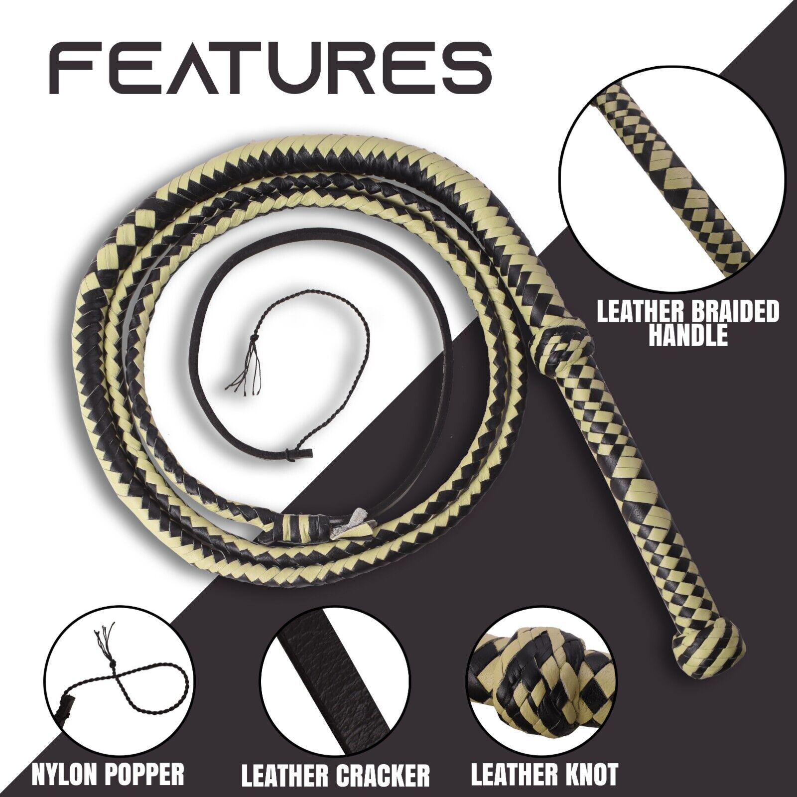 Leather Phobia Black/Cream Color Rope Core Whip is 08 feet long and 12 Plaits. Totally Hand made item