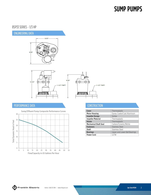The Little Giant BSP33V 1/3 HP, 2880 GPH, 115-volt sump pump is ideal for use as a sump pump, a backup pump, or for emergency water removal. Weighing only 8.6 pounds allows for easy installation or you can mount the pump above an existing pump as added protection against flooding in flood-prone areas. This pump is equipped with a 1.5-inch FNPT discharge and an 8-ft. power cord and has a small footprint, fitting in basins 14 inches or larger. This pump comes with a piggy-back vertical switch which activates when water reaches 7.25 inches and shuts off when water falls to 2.75 inches. The pump can be easily converted to a manual pump by unplugging the pump from the switch and plugging it directly into a wall outlet; perfect for emergency water removal or for servicing or testing the pump.