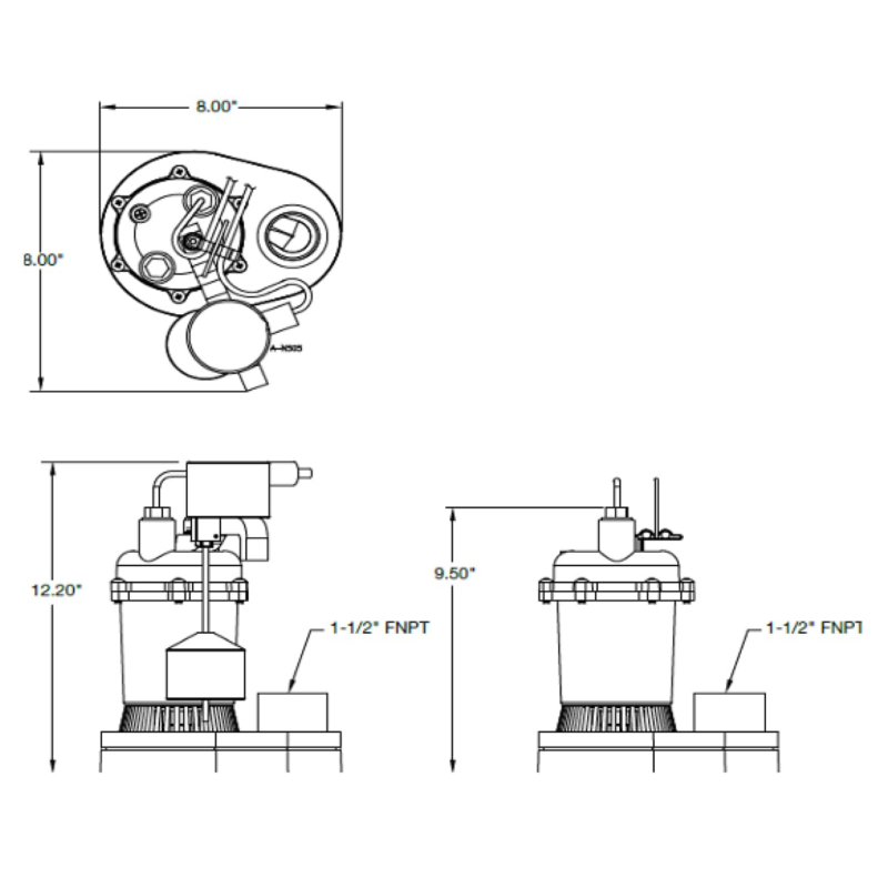 SPECIFICATIONS: 1/3 HP, 4.4 Amps, 460 Watts, 60 Hz, 48 GPM at 5-ft lift, 25-ft shut-off, maximum 10.8 PSI, 1.5" FNPT discharge, 8-ft cord, 95F liquid temperature rating