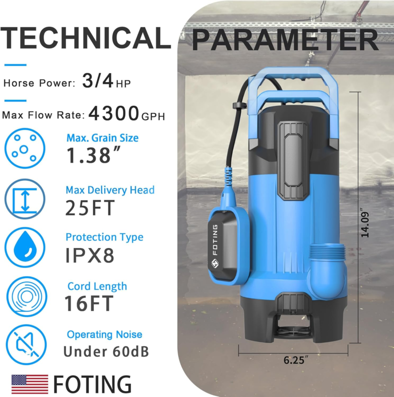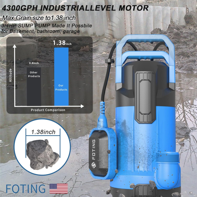 ?1.38? SOLIDS AVAILABLE?4300GPH submersible pump can handle up to 1.38? solids and removes water down to 1.5 inch from the surface, making it perfect ideal for high volume sewage discharge, swimming pools, basement drainage and more
