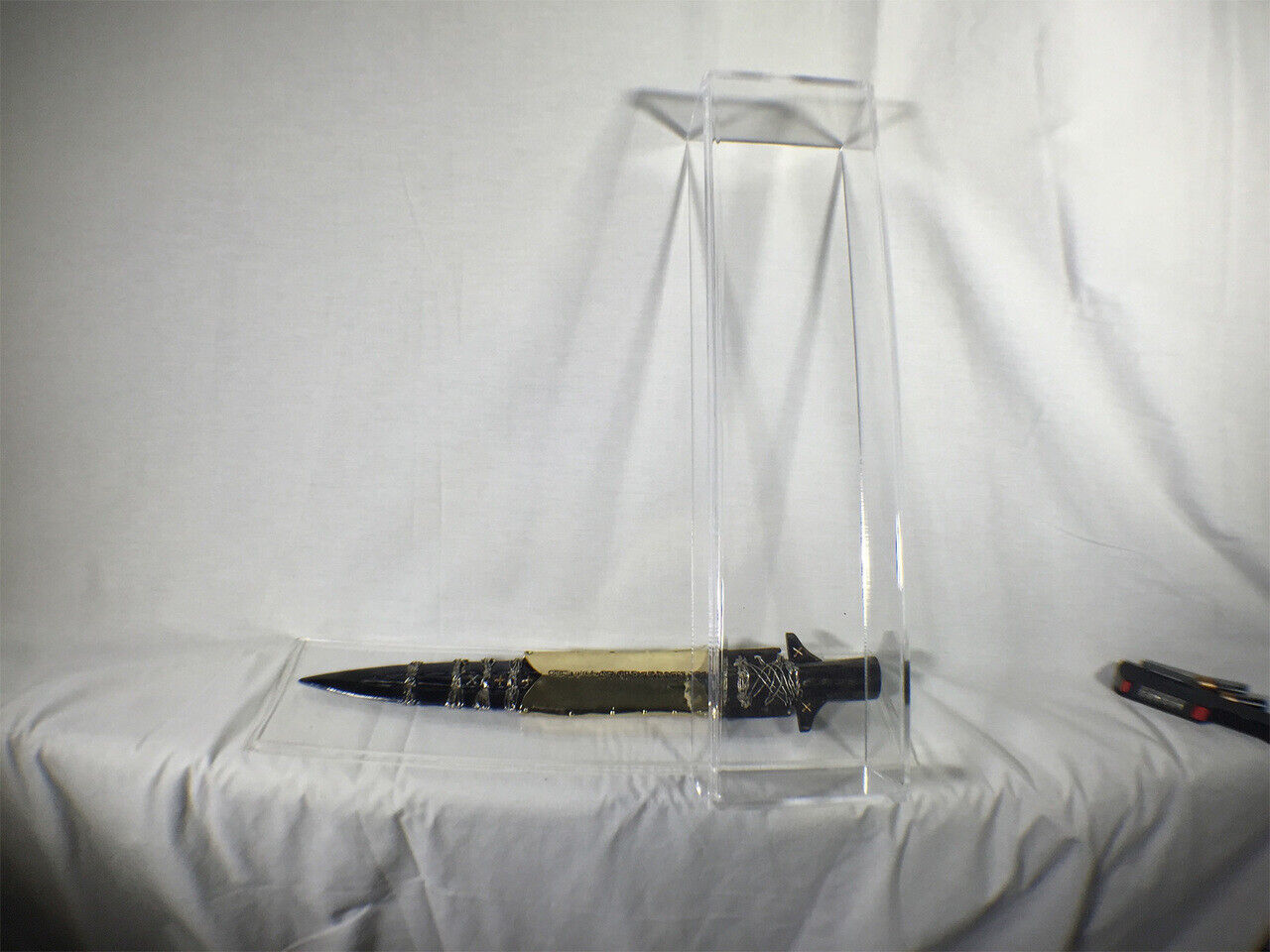 The Spear Case is made out of High Quality .25 inch Acrylic. It measures, in inches; 19.5 Long x 5 Wide x 3.5 high. It is a must to Display the Spear Of Destiny in.