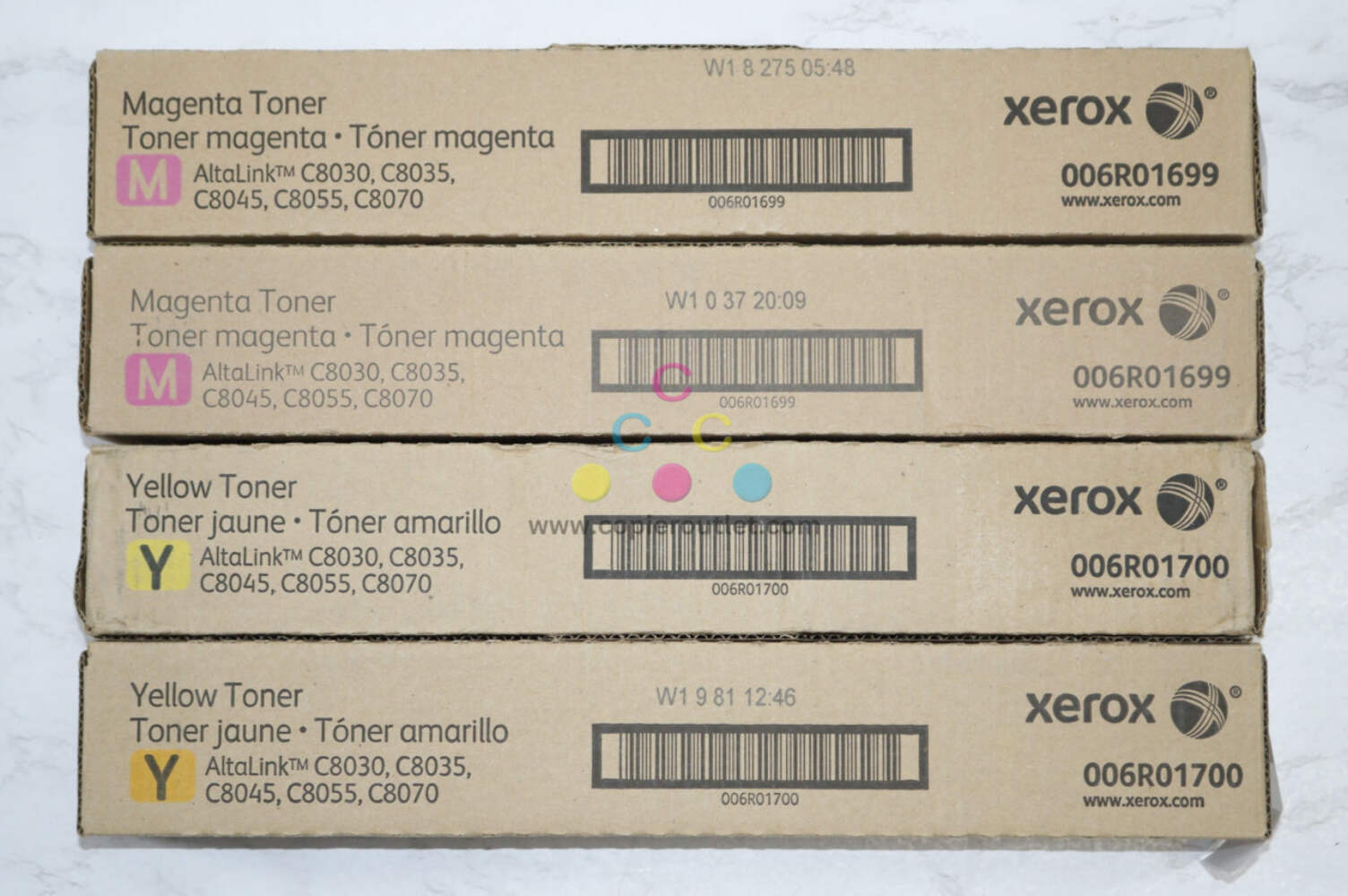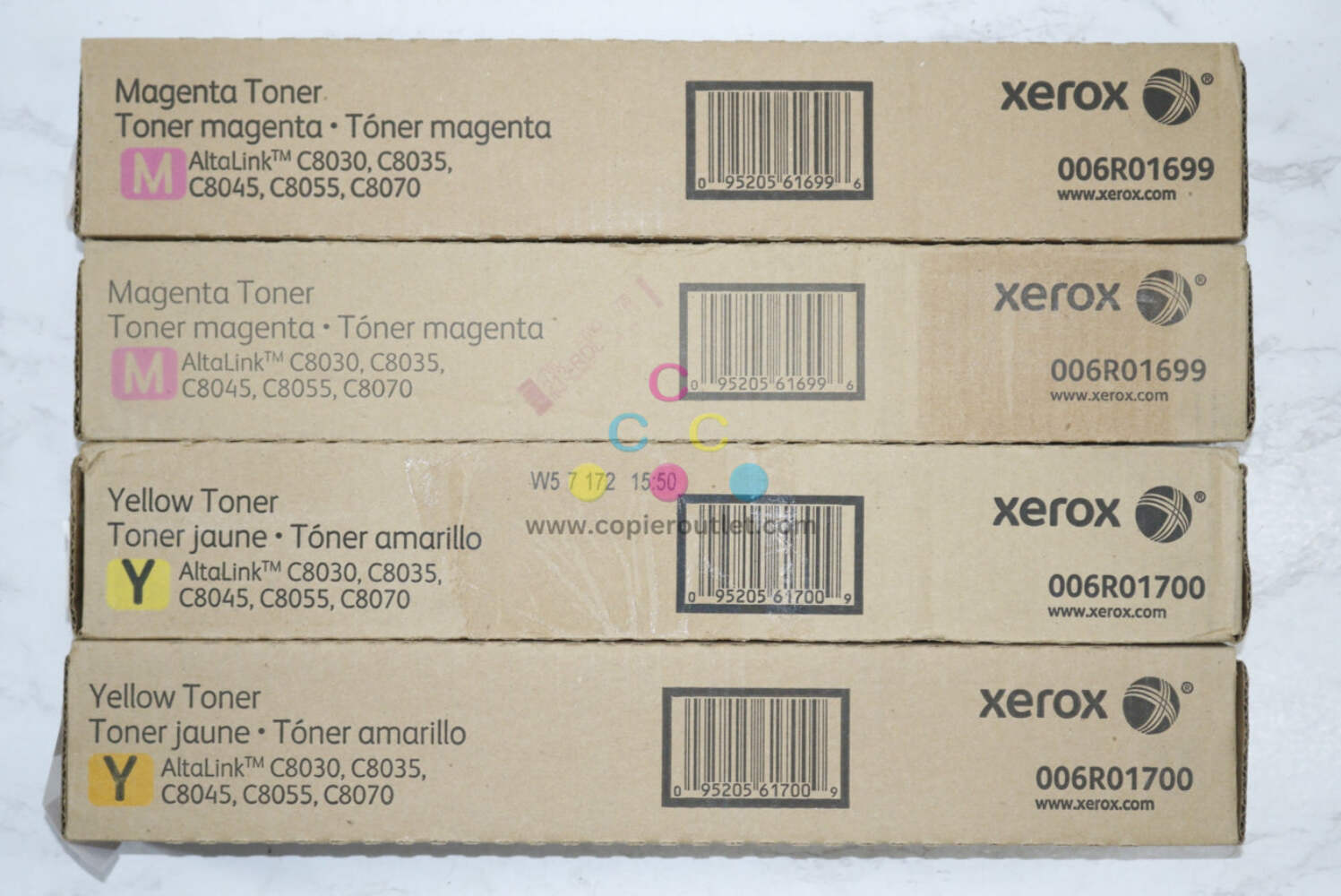 Xerox WorkCenter 7525 7545 7830 7855i 7970 + Altalink C8030 CMYK- Same Day Ship Genuine Xerox 006R01513 006R01514 006R01515 006R01516 CMYK Toner SET of 4 Xerox Work Center 7525 7530 7535 7545 7556 7830 7835 7845 7970 7830i 7835i 7845i 7970i Altalink C8030 C8035 C8045 C8055 C8070Package in plain brown Boxes shown in Pictures SAME DAY SHIPPING We are happy to help with any question For faster shipping service, please send us a message or contact us. Copier Clearance CenterCopier Clearance Center was established in 1993. We buy and sell both domestically and internationally and have wide assortment of used copiers, fax machines and printers of all brands, All of our copiers are in house and available for your inspection. They all have been tested and rated for functions, cosmetics and overall appearance. We also sell genuine accessories of all popular brands, Our accessories include toners, imaging units, developers and copier parts such as fax board, fixing unit, fuser unit, roller, cleaning brush, drum blades etc.For more detailed information on our current inventory of Copiers and Accessories all potential buyers or their representatives are welcome to give us a call. We are more than happy to assist you with the pricing and guide you to find the copiers you wish to buy.Best Regards,On-Line Sales TeamCopier Clearance CenterBusiness Hours (Pacific Time): Monday-Friday: 8:30 am to 5:00 pm Copier Clearance Center Promo Video - YouTube Video will open in a new windowUsing the App? Paste link into a browser window: [isdntekvideo] .ytvideo * { box-sizing:border-box; } .ytvideo { margin:.5em auto 40px auto; max-width:480px; font-family:arial; text-align:center; position:relative; min-height:120px; background-color:#555; } .ytvideo p { position:absolute; margin:0; color:white; background-color:rgba(0,0,0,.5); } .ytvideo .yt_hd { font-size:16px; width:100%; height:28px; line-height:28px; text-align:left; top:0; left:0; padding-left:10px; overflow:hidden; } .ytvideo .yt_ft { font-size:12px; width:100%; bottom:0; left:0; } .ytvideo img { display:block; max-width:100%; border:0; } .ytvideo a:after { content:"A025BA"; position:absolute; width:60px; height:50px; left:0; top:0; right:0; bottom:0; margin:auto; border:0; border-radius:10px; color:white; background:rgba(0,0,0,.6); font-size:24px; line-height:50px; cursor:pointer; } .ytvideo a:hover:after { background:#CC181E; } .ytvideo .yt_inp { position:absolute; top:100%; left:0; width:100%; text-align:center; padding:.5em .2em; xfont-size:18px; border:0; color:white; background: rgba(0,0,0,.7); } @media(max-device-width:960px){ .ytvideo { margin-bottom:60px; } .ytvideo .yt_inp { padding:1em .2em; } } All product and company names are trademarksTM or registered trademarks of their respective holders. Use of them does not imply any affiliation with or endorsement by them. 4 New Genuine Xerox Magenta and Black Toners 006R01699 Magenta (x2) 006R01700 Yellow (x2) For Altalink C8030,C8035,C8045, C8055,C8070 New ! SAME DAY SHIPPING We are happy to help with any question For faster shipping service, please send us a message or contact us. Copier Clearance Center Copier Clearance Center was established in 1993. We buy and sell both domestically and internationally and have wide assortment of used copiers, fax machines and printers of all brands, All of our copiers are in house and available for your inspection. They all have been tested and rated for functions, cosmetics and overall appearance. We also sell genuine accessories of all popular brands, Our accessories include toners, imaging units, developers and copier parts such as fax board, fixing unit, fuser unit, roller, cleaning brush, drum blades etc. For more detailed information on our current inventory of Copiers and Accessories all potential buyers or their representatives are welcome to give us a call. We are more than happy to assist you with the pricing and guide you to find the copiers you wish to buy. Best Regards, On-Line Sales Team Copier Clearance Center Business Hours (Pacific Time): Monday-Friday: 9:00 am to 5:30 pm Copier Clearance Center Promo Video - YouTube Video will open in a new windowUsing the App? Paste link into a browser window: [isdntekvideo] All product and company names are trademarksTM or registered trademarks of their respective holders. Use of them does not imply any affiliation with or endorsement by them. integration by