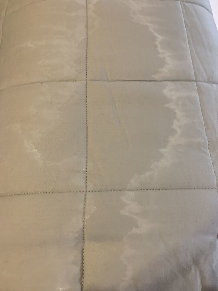 It looks like the blanket got wet in a couple of places. When it was shipped, see water mark in pictures.