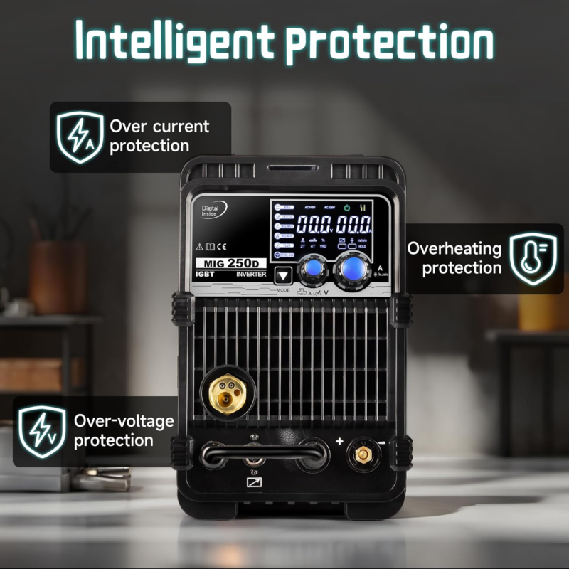 Built-In Safety Features Reliable Protection : The welders come equipped with essential safety protections including over-current, over-voltage, overload, and over-heating safeguards. With a smart cooling system that speeds up heat dissipation, it ensures long-lasting performance while keeping you safe during intensive welding jobs