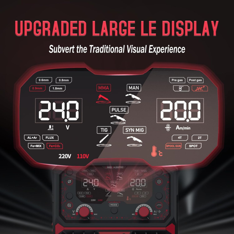 110/220V Multiprocess 7 in 1 Welder 200PRO Aluminum MIG Welder with Pulse Gas Mig/Pulse Mig/Gasless Flux Core/Mma/Lift Tig/Spot Weld/Spool Gun LED Display