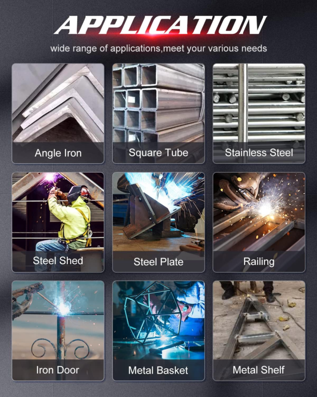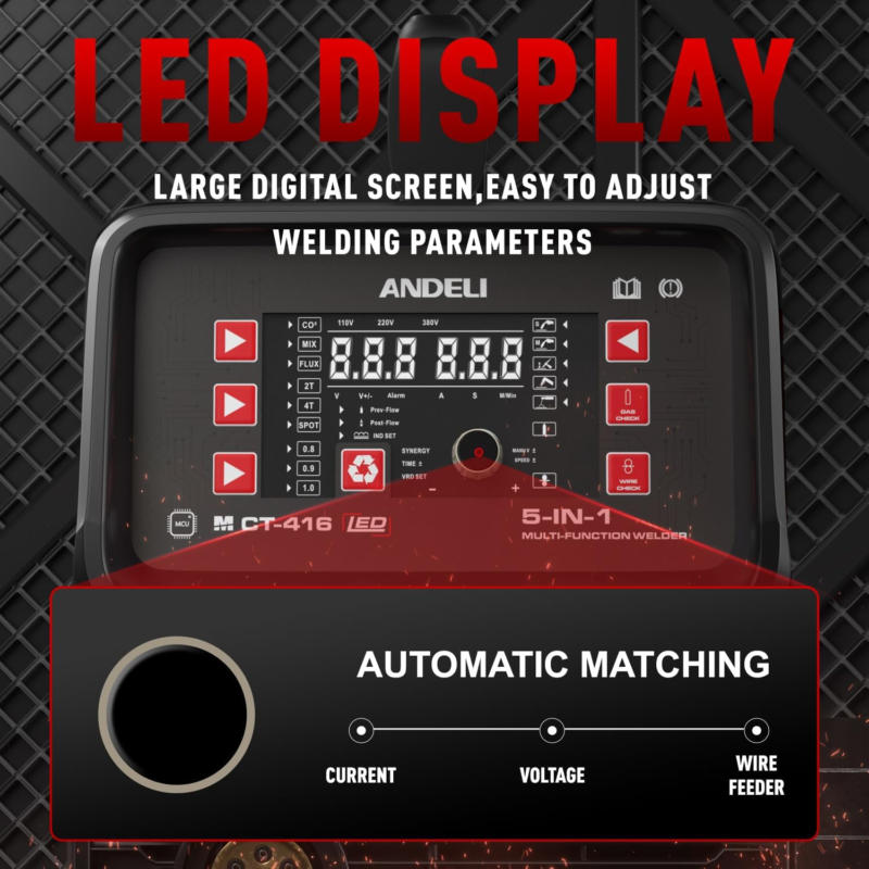 LED Displayed: It is super easy and convenient to chose the welding mode, material, welding wires, tungsten rods, electorde and the workpiece thicness you need by spinning and pressing the buttons. It will shows all the parameters clearly, large High-Definition, large screen, increases the visual clarity and improves the efficiency of the operation.
