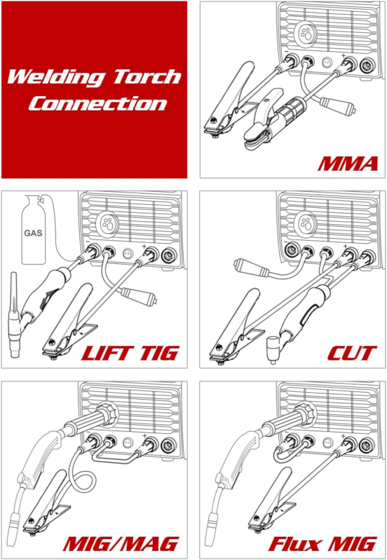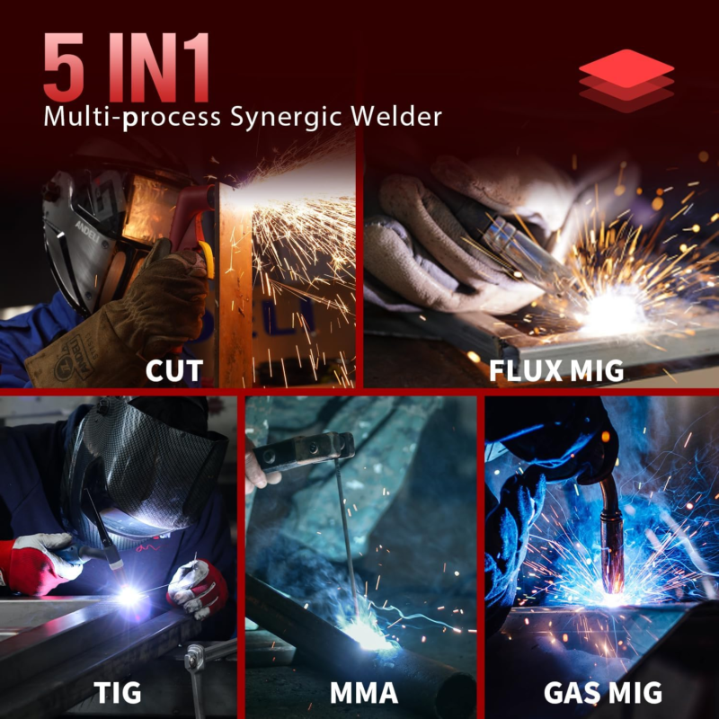 Multi-Function: Multiprocess plasma cutter welder combo, 5 in 1 Multifunctional Welding and Cutting Machine: Lift Tig, Flux Mig, Gas Mig, Stick and Plasma Cut available. Offering a comprehensive solution for a wide range of welding and cutting tasks, making it ideal for professionals and DIY enthusiasts alike.