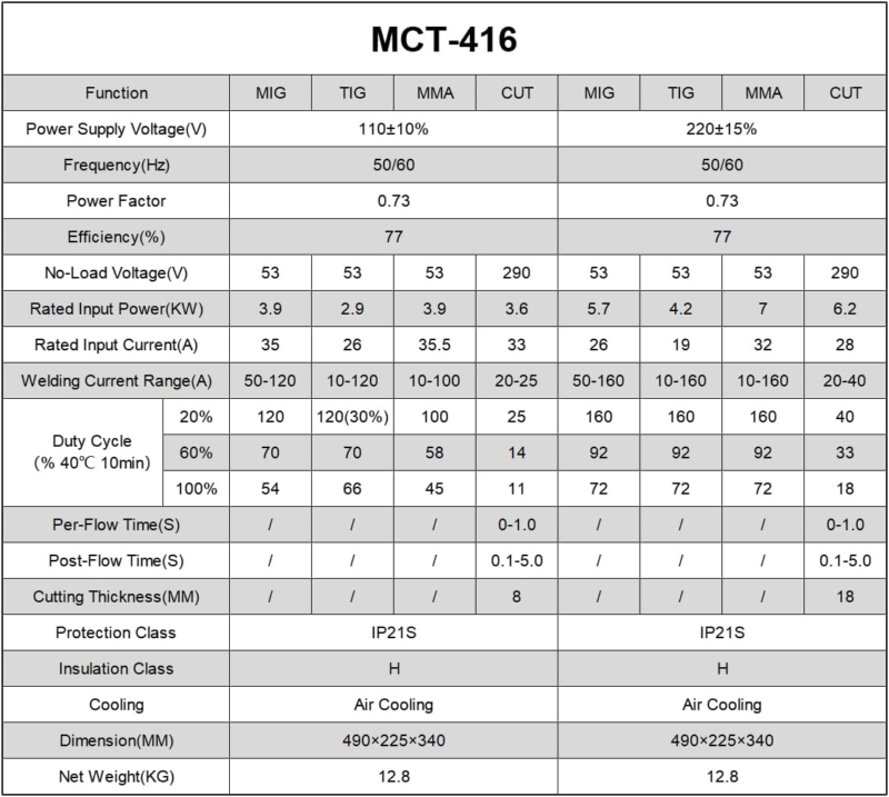 5 in 1 Multiprocessor MIG Welder10/220V Dual Voltage Welding Machine Gas Mig/Flux Mig/Lift Tig/Stick/Cut (MCT-416 PULS)