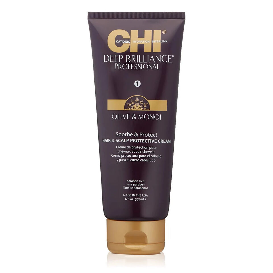 Farouk CHI Deep Brilliance Hair And Scalp Protective Cream Sooth Protect 6 Ounce It combines the rich hydration of Olive Oil with Monoi Oil?s unique blend of Coconut Oil and Tiare Gardenia flowers that helps strengthen hair while reversing damage and protecting hair from future damage. Provides superior moisture and reconstruction to textured and chemically-treated hair, while promoting healthy more manageable tresses.