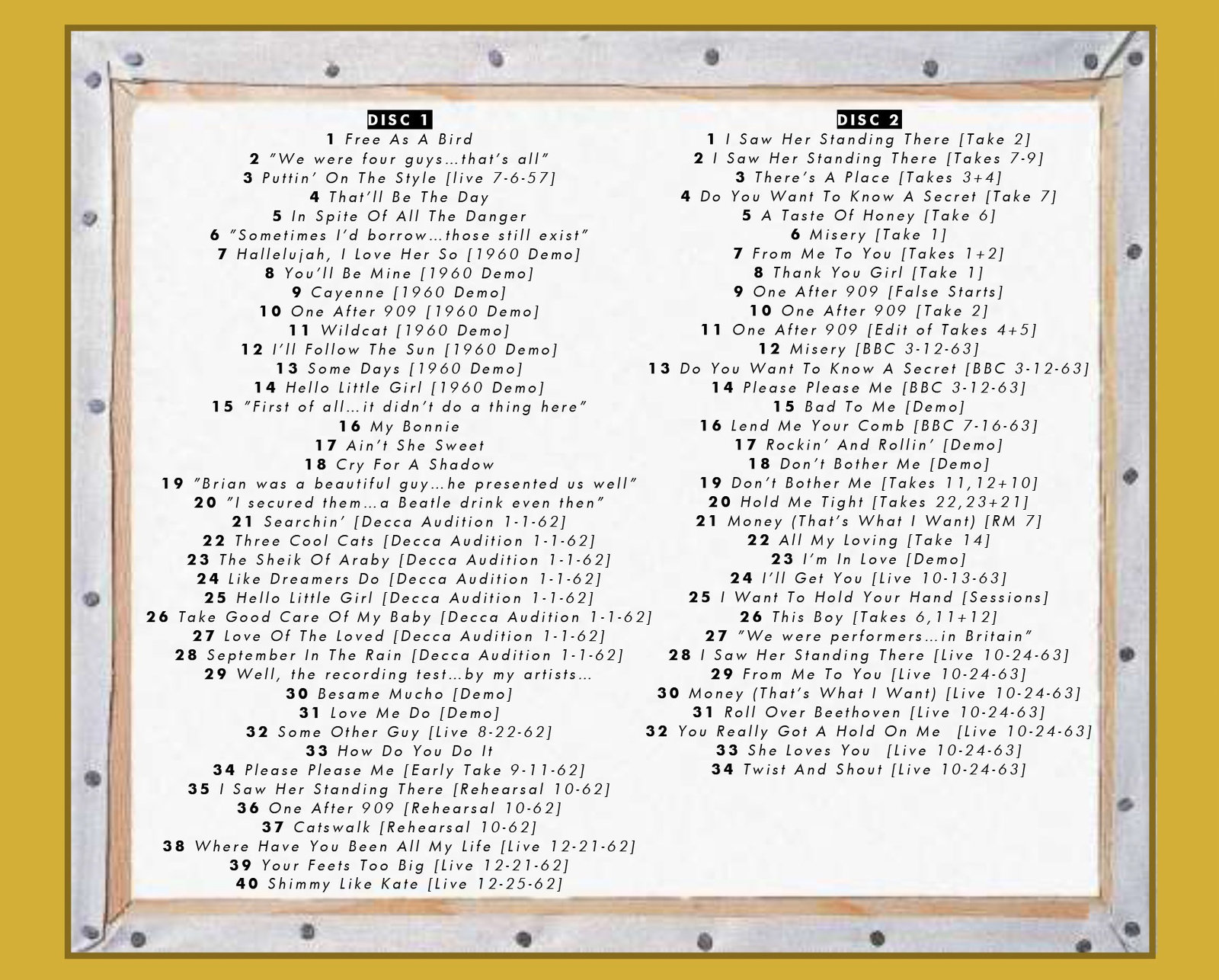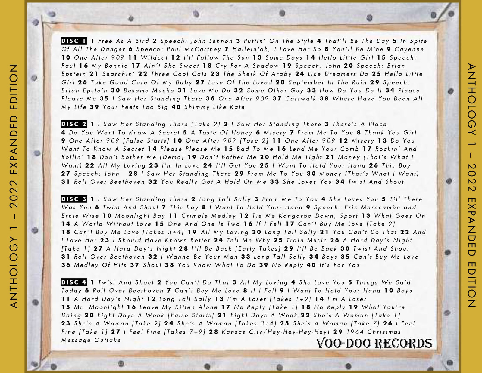 OVER 5 HOURS OF MUSIC!! Incredible Expanded version of classic Beatles Anthology Volume One takes the 60 tracks from the official 1995 release and adds over 80 additional tracks to present the most complete collection of the Beatles outtakes/alternates/live versions that has ever been assembled and everything is presented here in the best sound quality available. OVER THIRTY NEW STEREO MIXES are included here over the original Expanded Anthology set from 2018 (and they are all noted in the track listing below)! There's way too many highlights to list here, but rest assured that if you want it, it is here. All the "wrongs" from the official Anthology have been corrected here (no weird edit of Shout), and again the sound quality is top notch throughout. This set has been painstakingly put together and has been in the works for over twenty years! 143 tracks on four discs which span the first phase of the recorded career of The Beatles (1958-1964). All the great outtakes that were skipped over on the official Anthology are here Fun bonuses abound, such as the complete 1964 Hollywood Bowl concert (at the start of Disc 4), and yes it's in perfect stereo sound quality. Speaking of stereo, there are lots of new stereo versions of previously mono-only tracks included in this set for the first time. The discs come housed in an attractive 4-disc jewel case with full color artwork included. Perfect gift for that special Beatle fan in your life (or even YOURSELF!)