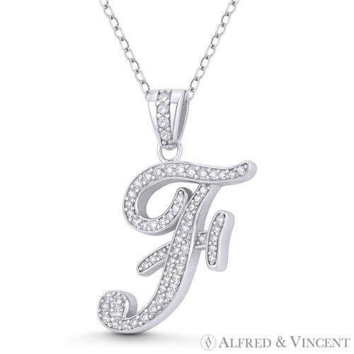 Initial Letter "F" Cursive Script CZ Crystal 925 Sterling Silver Rhodium Pendant