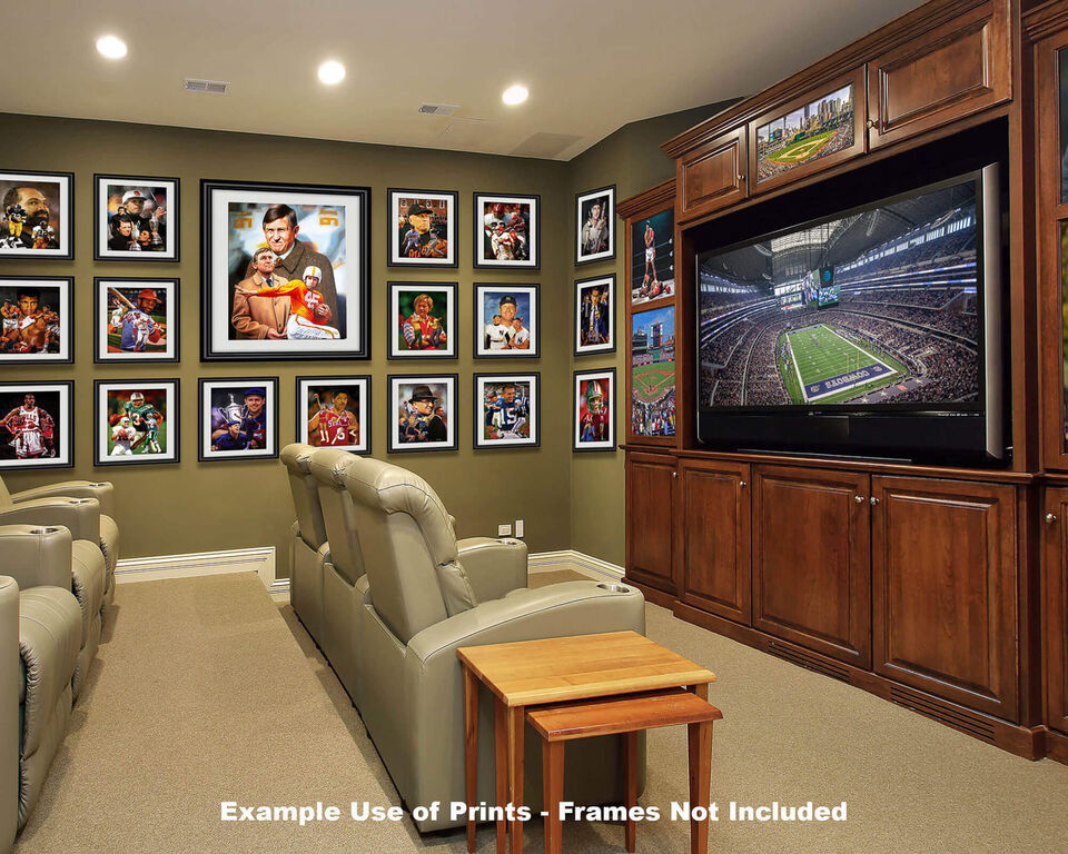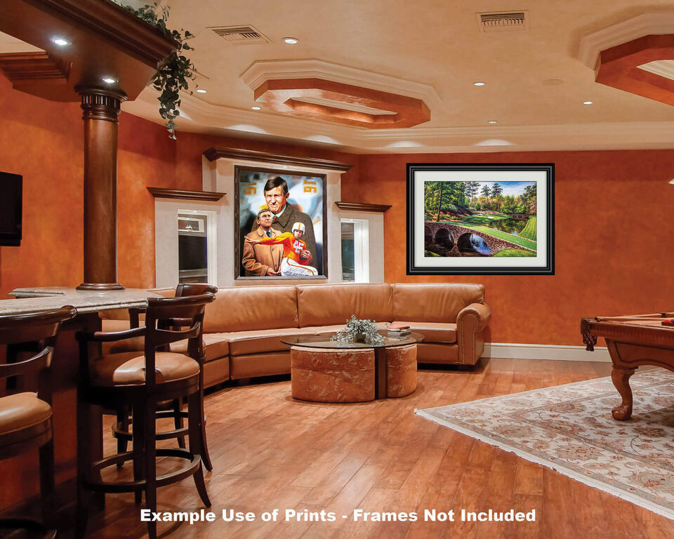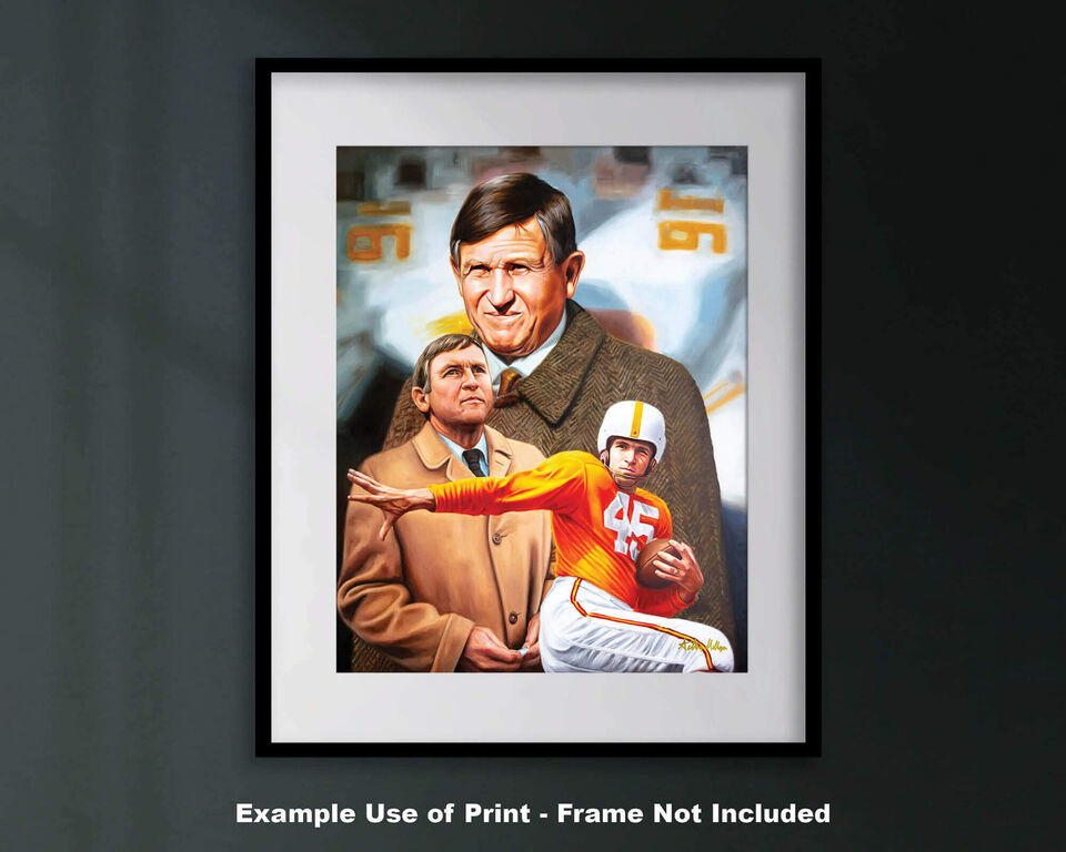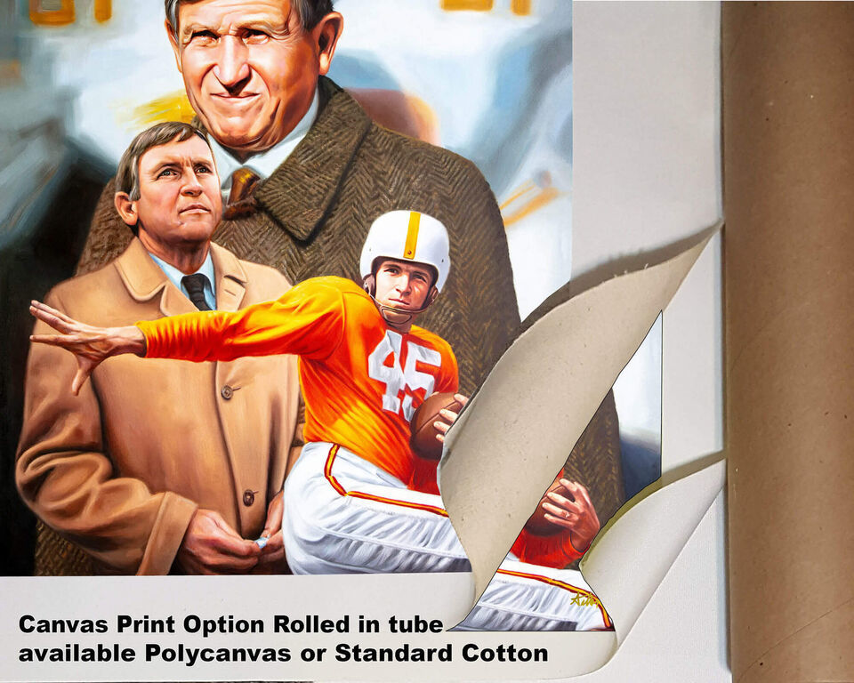 This fine art print from oil painting by Arthur Milligan features Johnny Majors legendary Head Coach Tennessee Volunteers, UT Vols Collegiate NCAA Football Team Giclee Print. This exclusive Tennessee Volunteers, UT Vols Johnny Majors title is a 11x14in Matte Paper Print, 28x36cm. The 192gm 10.3mil enhanced paper. It appears flat matte with no sheen (NOT shiny.) The print will appear as glossy as the glass when framed (mat, picture frame or glass NOT included.) SEE OPTIONS for Size Stye (8x10-40x50in) in choice of a fine art print on Matte Paper, gallery wrap canvas stretched over 3/4 inch thick wood frame, or high quality print on matte polyester or matte cotton canvas rolled and shipped in a tube. Viewing screens have different color calibration (light, dark, green cast, blue cast etc...) so the print color may vary. The print colors are calibrated to match the original art or photo.