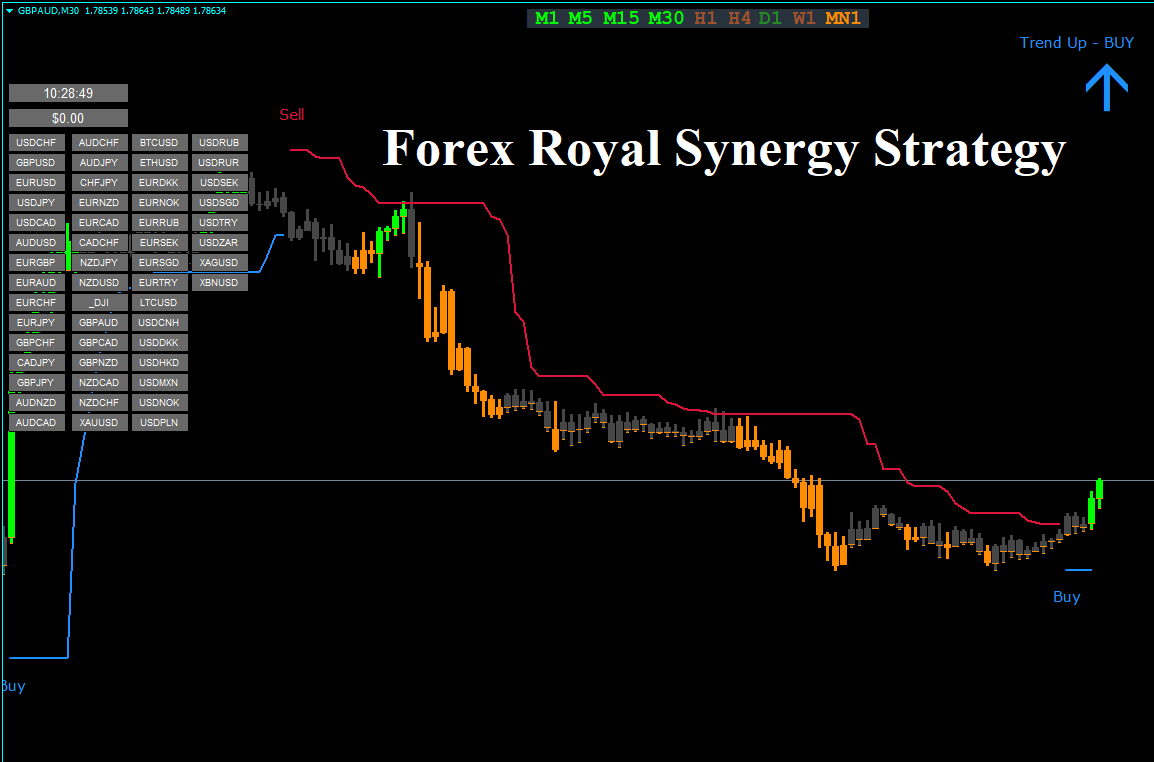 Forex Royal Synergy Strategy will generate trading signals based on predefined settings. The UP and DOWN signals will notify you of each new trading setup as defined in the indicator’s settings.