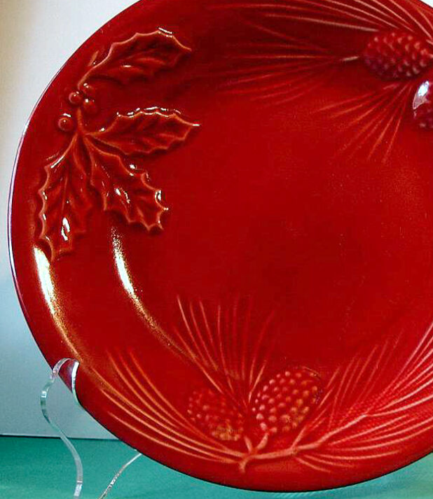 raised design of pine cones and holly, the brilliant rustic red glazed