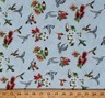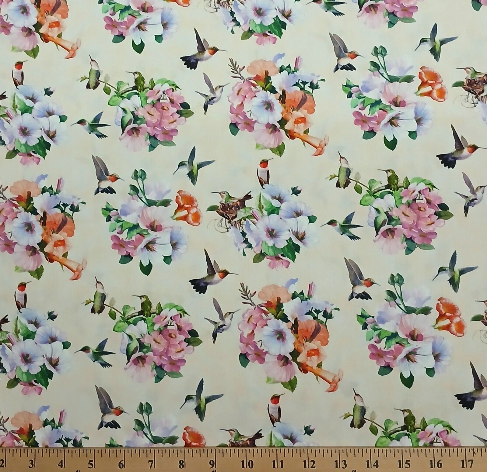 Cotton Flowers Floral Hummingbirds Birds Cream Fabric Print by Yard D373.56
