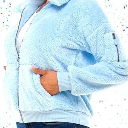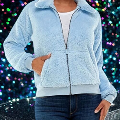 Elevate your fall and winter wardrobe with this beautiful ice blue SOCIALITE Nia jacket in size small. Crafted from high-quality polyester sherpa fabric, this basic jacket features a full zip closure, long sleeves, and a mid-length cut for a perfect fit. The spandex-lined interior provides added comfort and warmth, while the solid pattern adds a touch of elegance.
