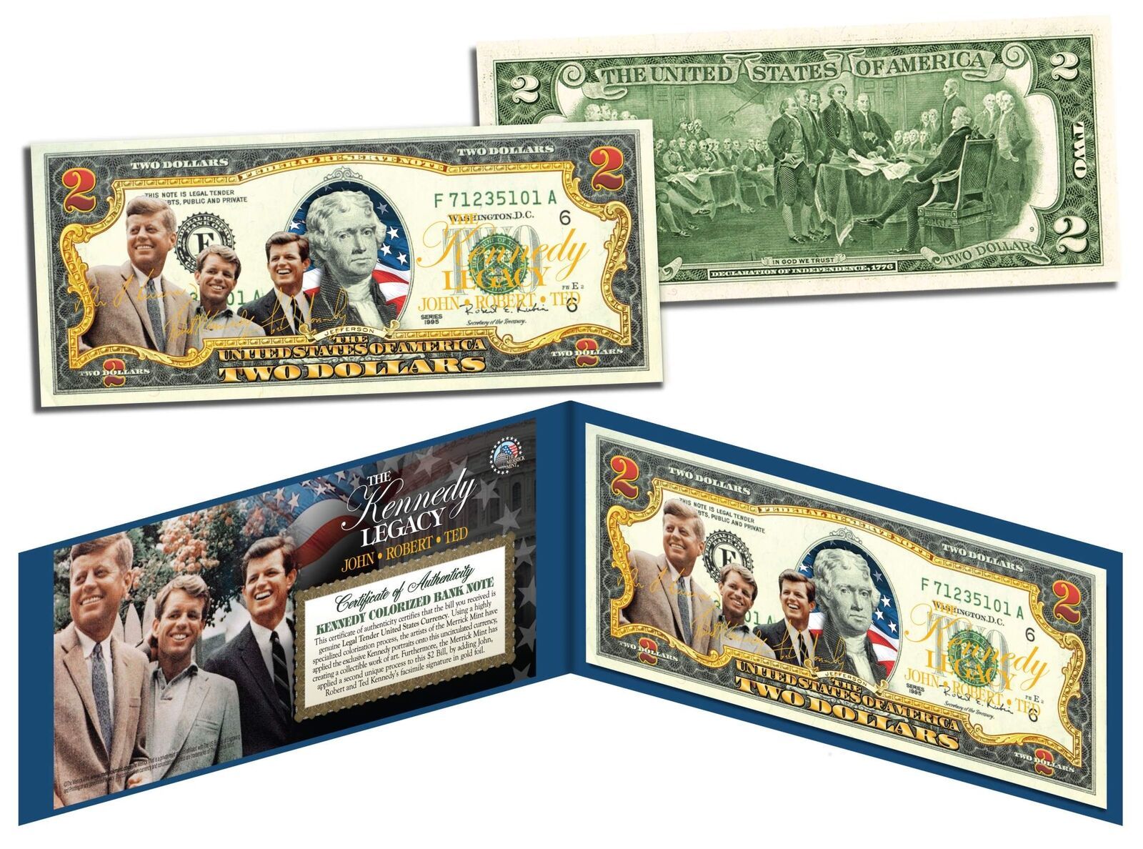 This uncirculated $2 Bill is Genuine Authentic Legal Tender of the United States, which has been enhanced with beautiful colorized images of the KENNEDY LEGACY brothers: President John F. Kennedy, Senator Robert F. Kennedy and Senator Ted Kennedy. The full colorized images are accomplished through a revolutionary new authentic genuine colorization process pioneered by The Merrick Mint. Each bill comes displayed in a blue folio with a Certificate of Authenticity to guarantee that your bills are authentic and recognized by every monetary authority around the world, and assuring its Collector Edition status. Each $2 Bill is in FRESH, CRISP, UNCIRCULATED condition, and was directly removed from untouched wrapped Federal Reserve sealed packs. Former U.S. President Thomas Jefferson is featured on the obverse of the note, along with the special colorization overlay. The Signing of the Declaration of Independence by John Trumbull is featured on the reverse. It is the only U.S. Currency note that features two Presidents, John Adams and Thomas Jefferson, and it is one of the most rarely seen BILLS in circulation and actual use.
