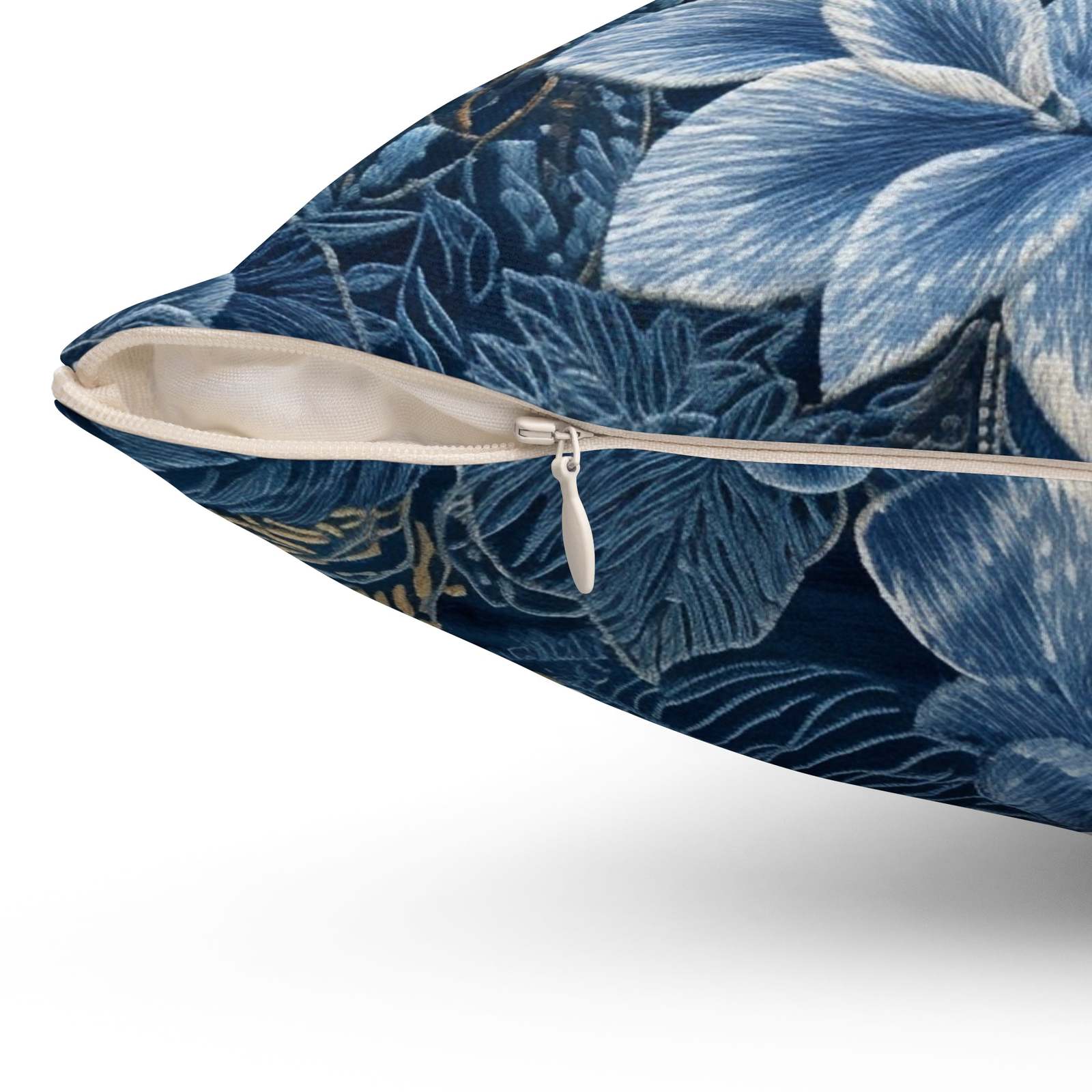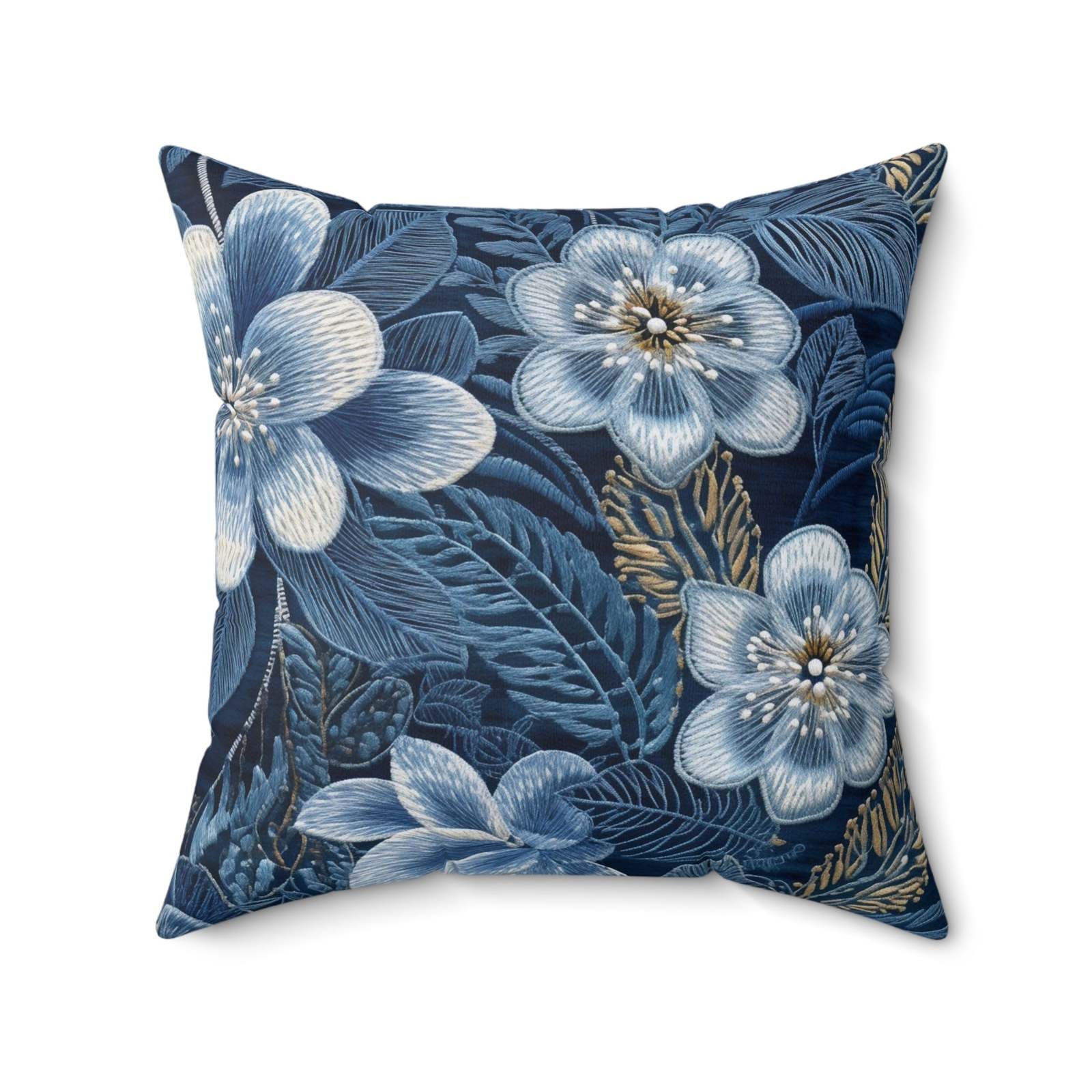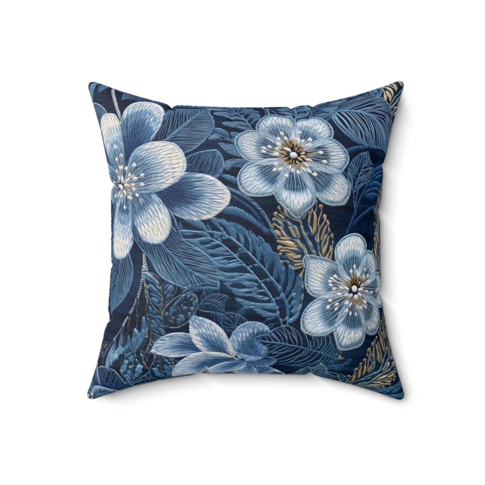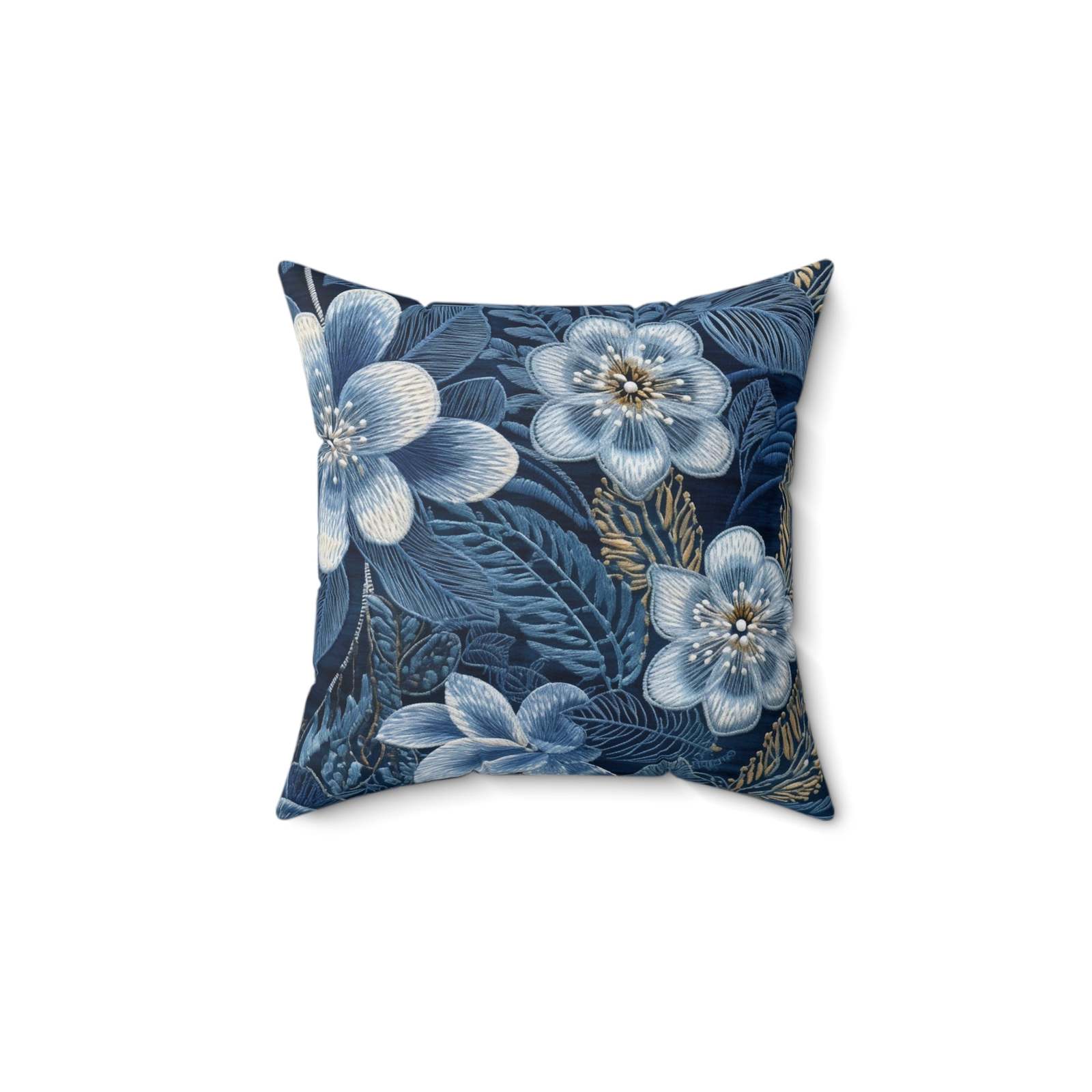 Flower Blossom Embroidery Floral on Denim Style - Spun Polyester Square Pillow
