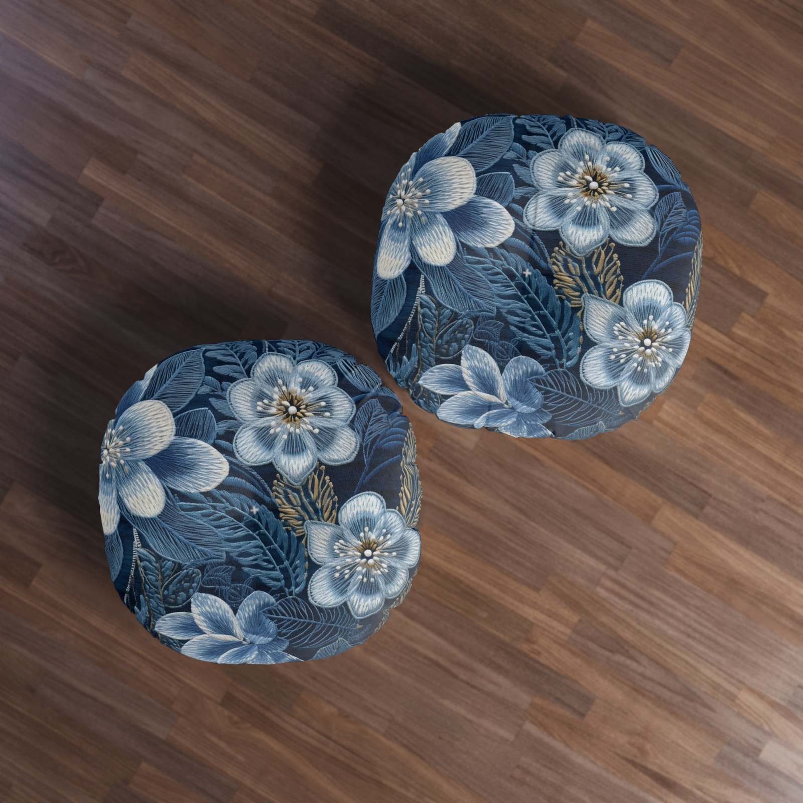 Flower Blossom Embroidery Floral on Denim Style - Tufted Floor Pillow, Round