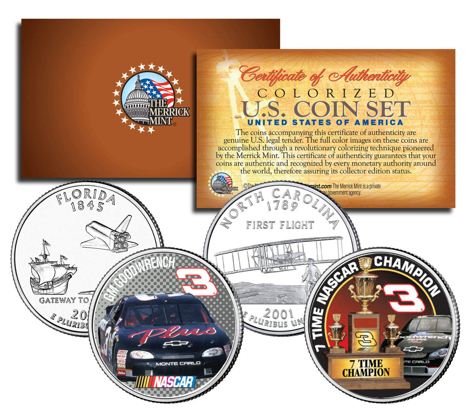 Here is your chance to own a Dale Earnhardt complete set of two (2) colorized Statehood Quarters U.S. Coins including Dale Earnhardt?s ?7 TIME NASCAR CHAMPION? North Carolina 2001 State Quarter and ?GM GOODWRENCH #3? Florida 2004 State Quarter. These high-quality, genuine Legal Tender United States coins have been colorized using a unique painstaking multicolor authentic process by the Merrick Mint. Colorizing coins involves the unique application of special inks directly to the surface of a coin that achieves a level of detail, color saturation, and durability that is #1 in the coin industry. The result is an everlasting colorized coin collectible of ultra-high quality. Each coin features an emblematic design of the State on the reverse and colorized images regarding Dale Earnhardt on the obverse (portrait of George Washington design). Each coin comes in a premium coin capsule and the set comes with a Certificate of Authenticity to guarantee that your coins are authentic and recognized by every monetary authority around the world, assuring its Collector Edition status.