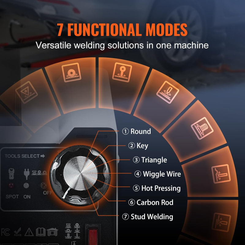 VEVOR auto body dent puller welder features 7 functional modes, including round, OT, triangle washer, wiggle wire, hot pressing, carbon rod, and stud welding. It caters to diverse repair needs and delivers efficient solutions for carbon steel, stainless steel, and iron.