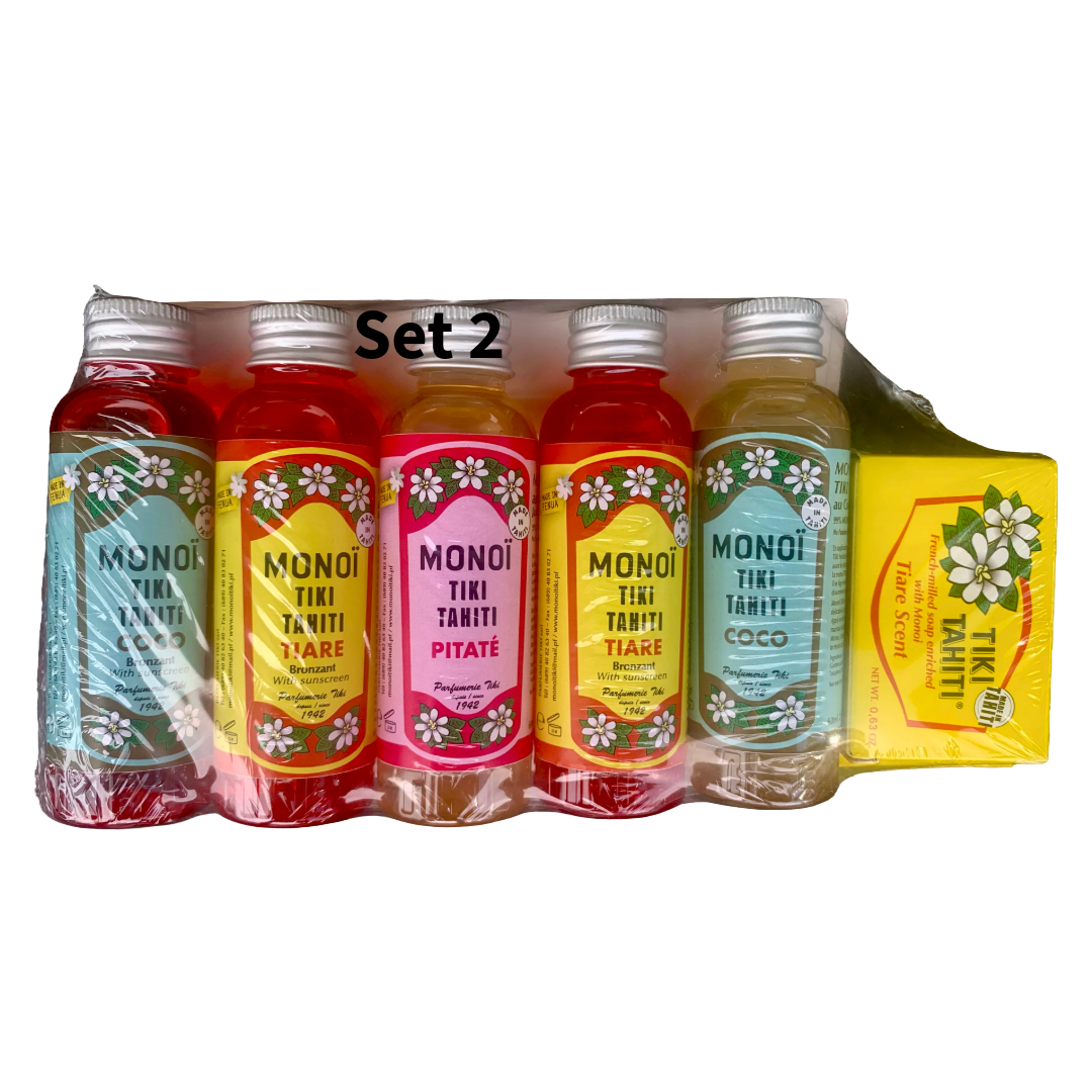 Discover the luxurious world of Monoi with this Monoi Tiki Tahiti 5-Bottle Gift Set, featuring five travel-sized Monoi oils and two beautifully crafted Tiare soap bars. This Coffret Decouverte Monoi Tiki set offers a curated selection of premium Monoi oils, perfect for pampering your skin and transporting your senses to the tropics.