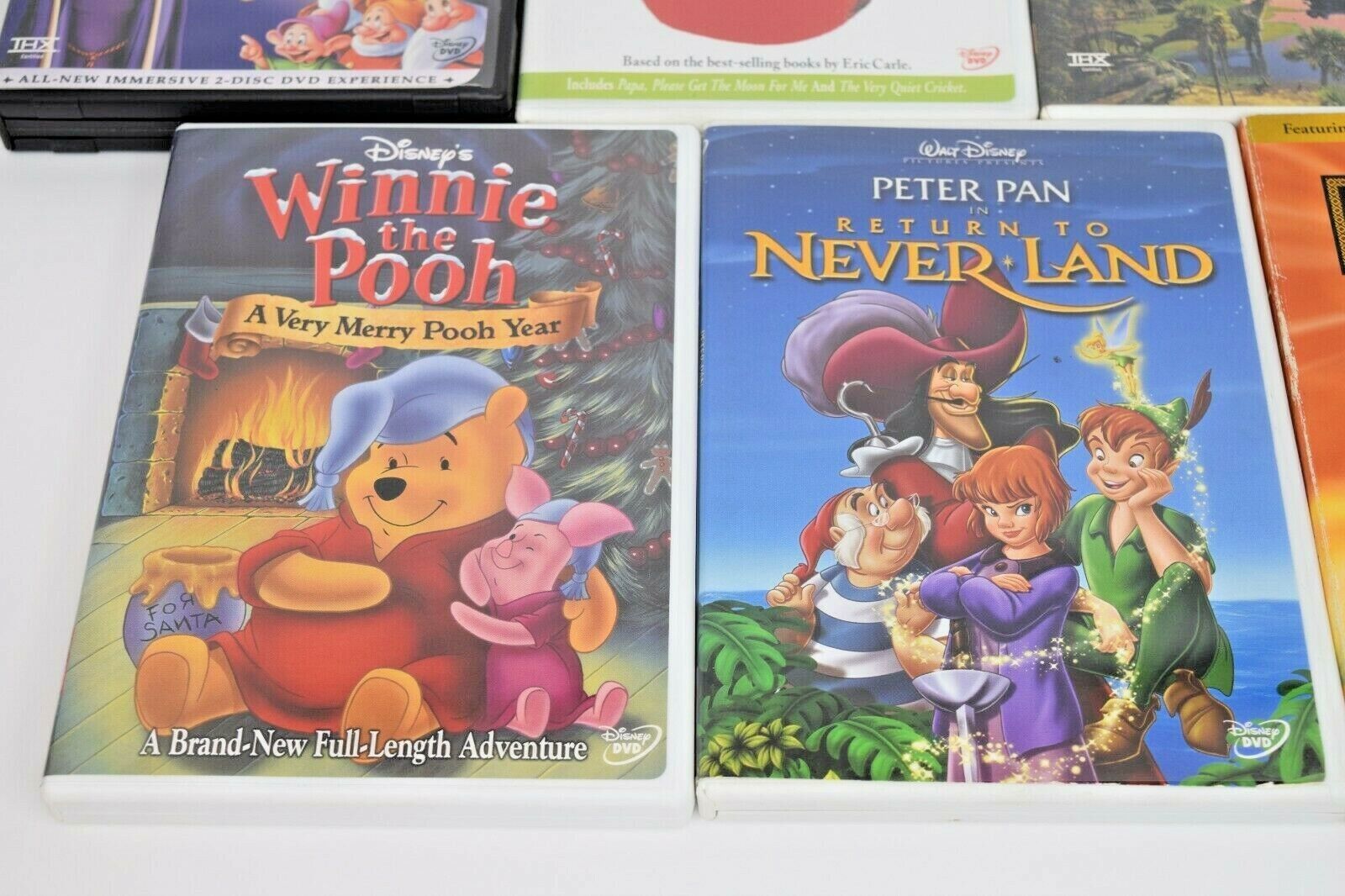 Lot of 7 Disney DVDs. Movies are: Snow White and the Seven Dwarfs - Platinum Edition, The Very Hungry Caterpillar, Dinosaur, Bambi II, Winnie the Pooh A Very Merry Pooh Year, Return to Neverland, and The Lion King 1 1/2. All are pre-owned in Good or Very Good Condition. Some discs have some light wear, all play fine. Cases are good with different amounts of shelf wear. See all photos for details and condition. Will ship USPS Media Mail.