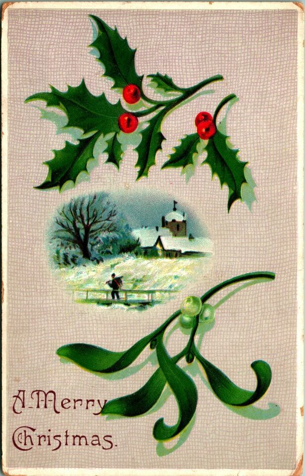 Mistletoe Holly Cabin Scene A Merry Christmas Embossed DB Postcard C4