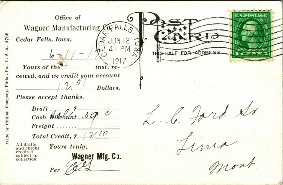 Wagner Manufacturing Company Receipt Cedar Falls Iowa IA 1917 DB Postcard D10