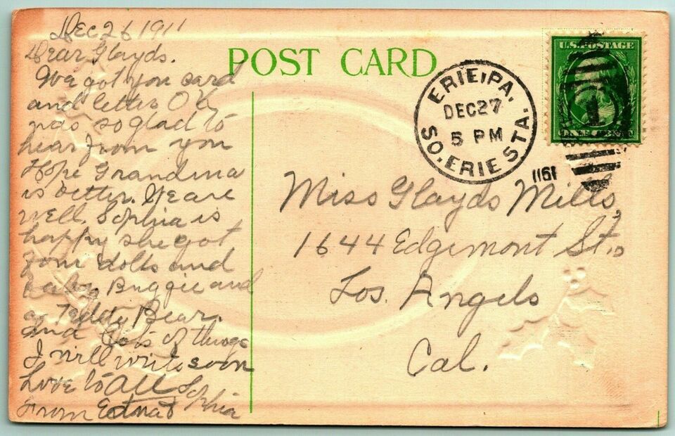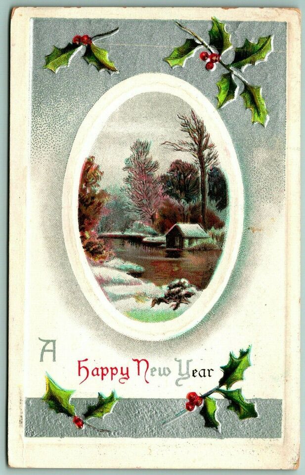 Happy New Year Holly Winter Cabin Scene Embossed 1911 DB Postcard G12