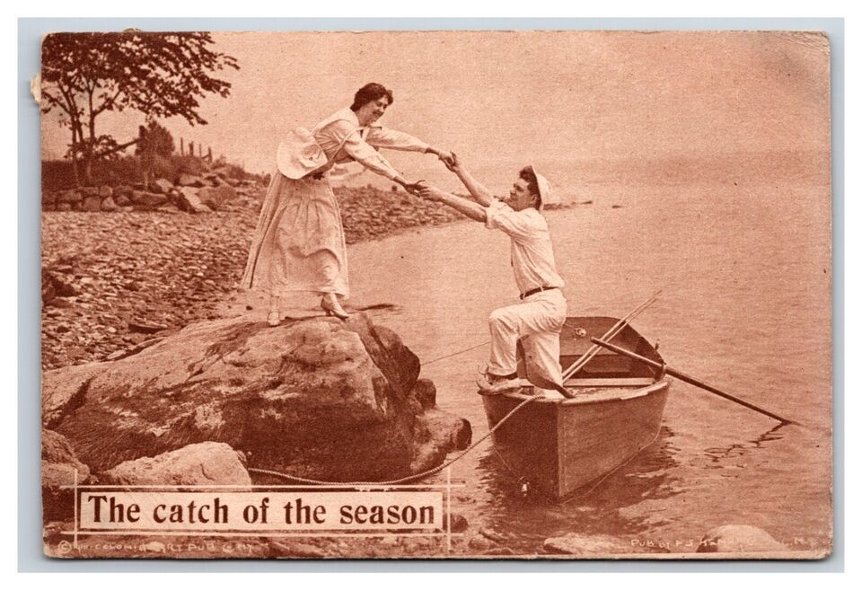 Romance Couple on Boat The Catch of the Season Sepia DB Postcard U8