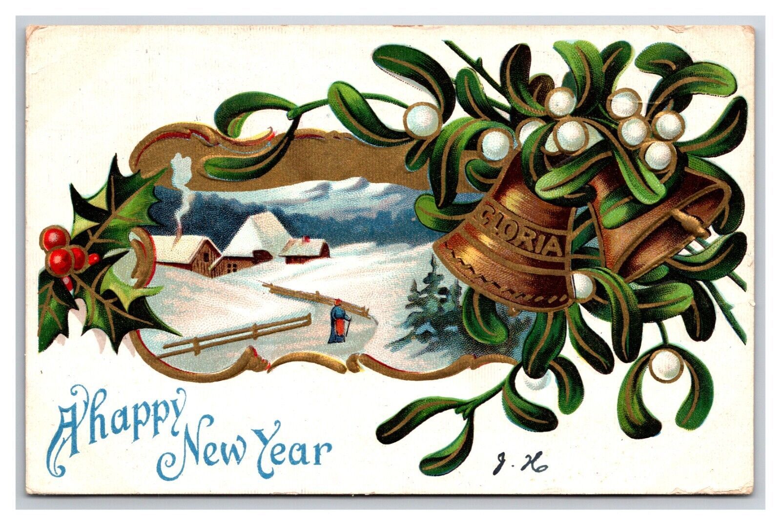 Happy New Year Mistletoe Holly Winter Cabin Embossed DB Postcard A16