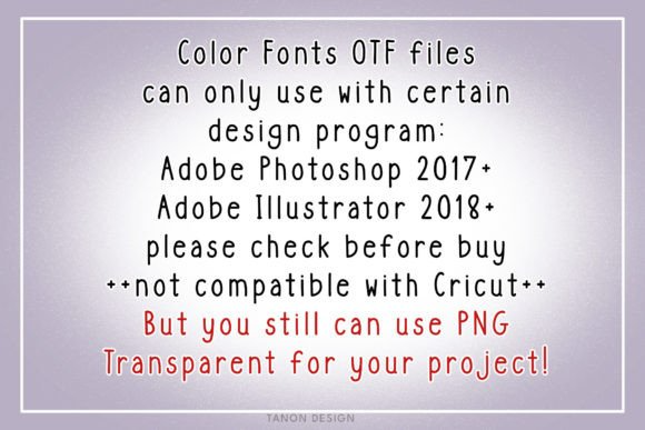 Note! The color version of this font is only compatible with certain design programs incl. PhotoShop, Illustrator, Silhouette, and Inkscape. The OTF and/or TTF files of the color version are not compatible with Cricut. For more information on how to use this type of font please check our Ultimate Font Guide.