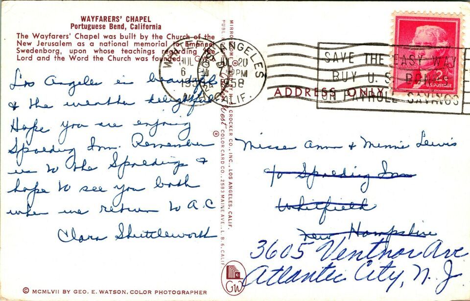 Wayfarers Chapel Rancho Palos Verdes California CA 1958 Chrome Postcard A3