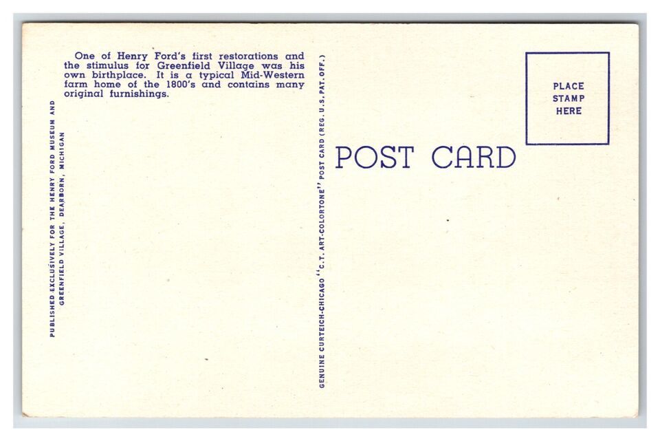 Henry Ford Birthplace Dearborn Michigan MI UNP Linen Postcard S8