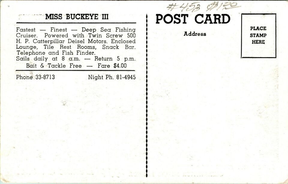Miss Buckeye III Deep Sea Fishing Cruiser Clearwater Beach FL 1954 Postcard UNP added to cart.