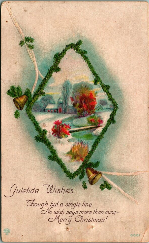 Pine Frame Cabin Scene Gold Bells Yuletide Wishes UNP DB Christmas Postcard B2