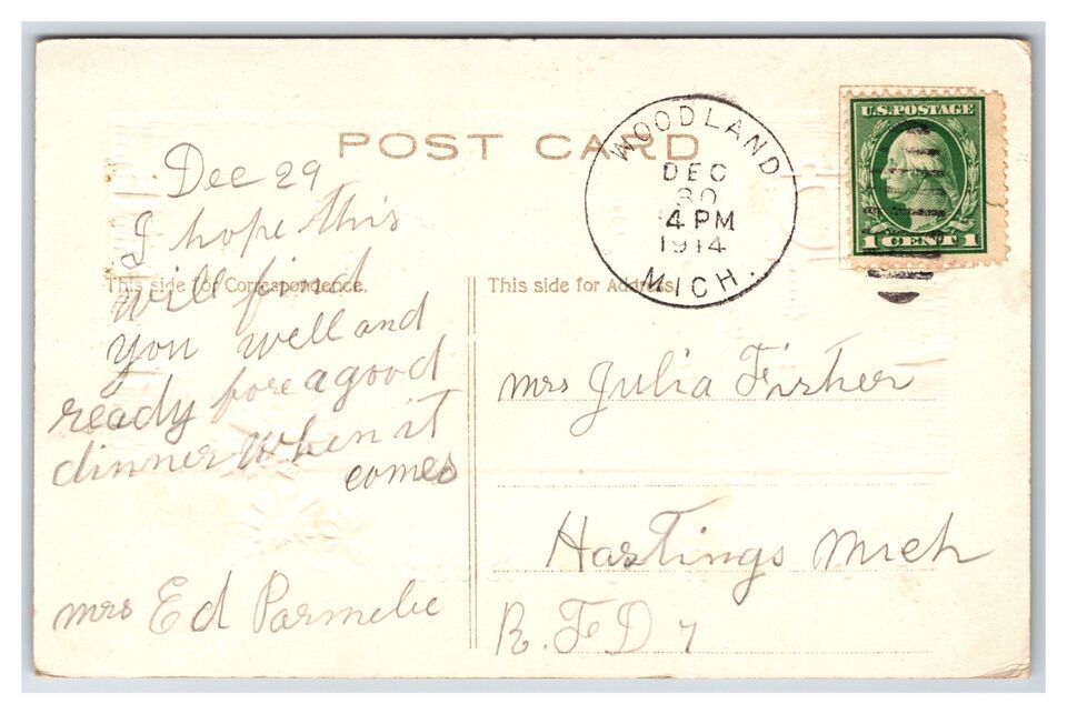 Normal wear associated with an old postcard it might have creases, a corner bump, ink on the front etc.