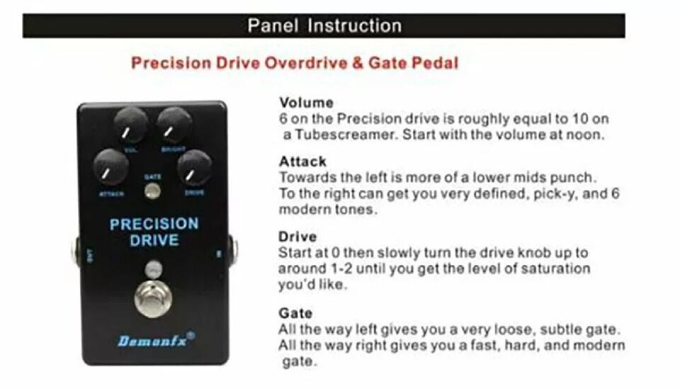 To use it the way it is built for, keep both controls fairly low when placed in front of a high-gain amp. This will essentially "tighten" up your tone, not adding too much gain but rather flattening some unwanted loose low-end while providing more mid-range definition (punch/clarity) and giving a more saturated sound. For those technical riffs, the Precision Drive delivers all of the clarity needed to cut through in a frantic mix.