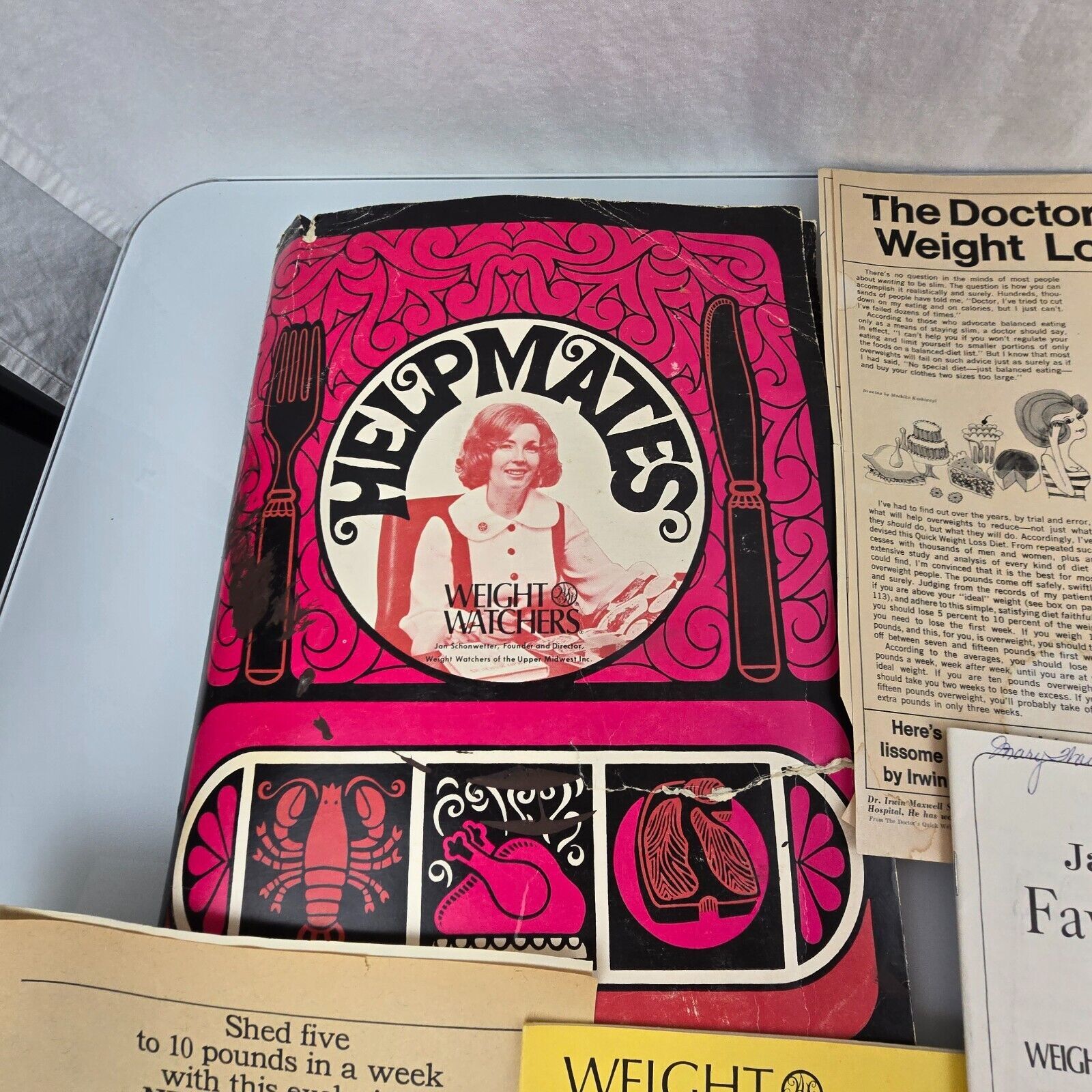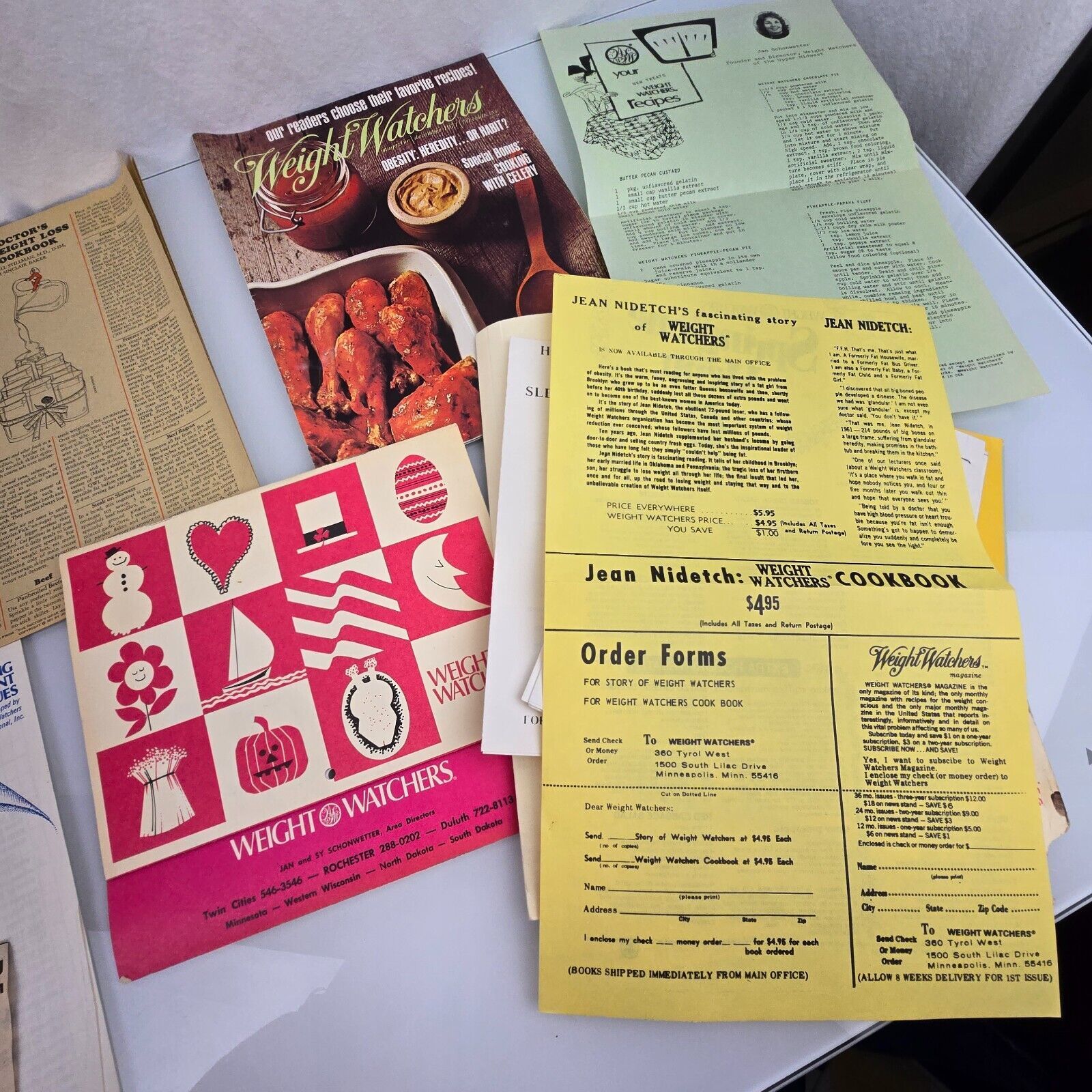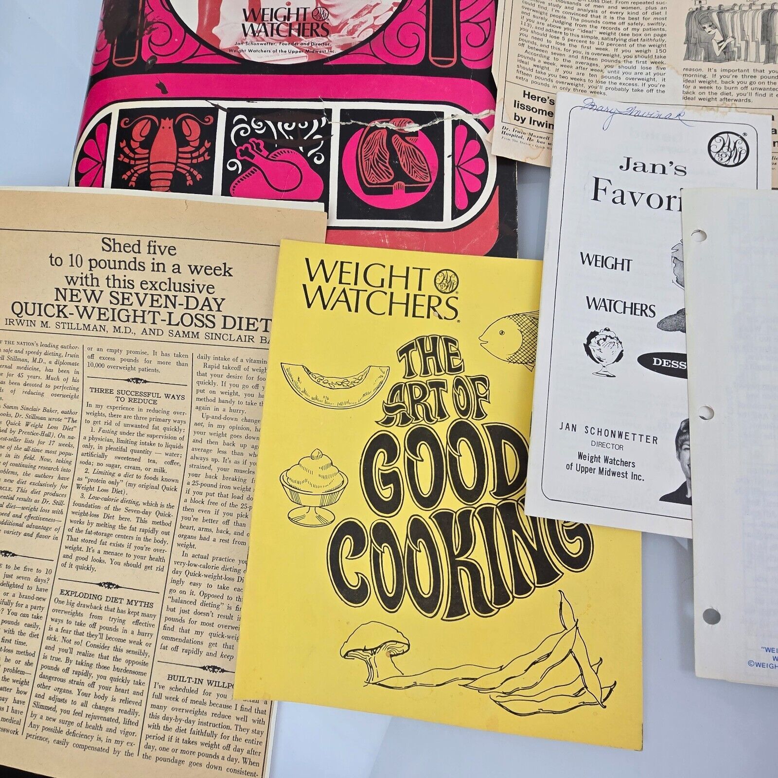 Bundle of my mom's old Weight Watchers stuff from 1971. Includes December 1971 magazine, calendar, recipes and some weight loss clippings from other magazines from around that time. Good used condition.