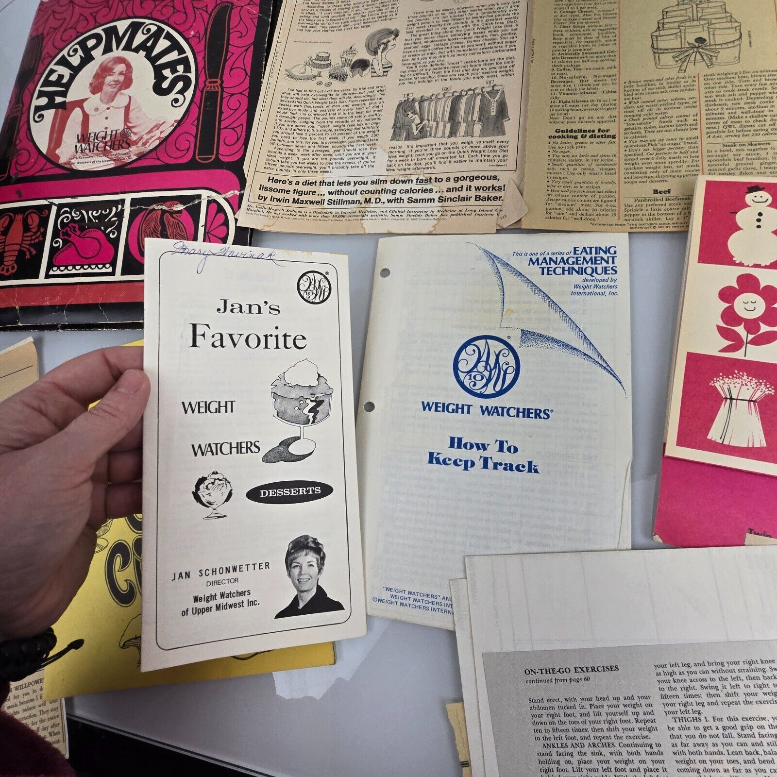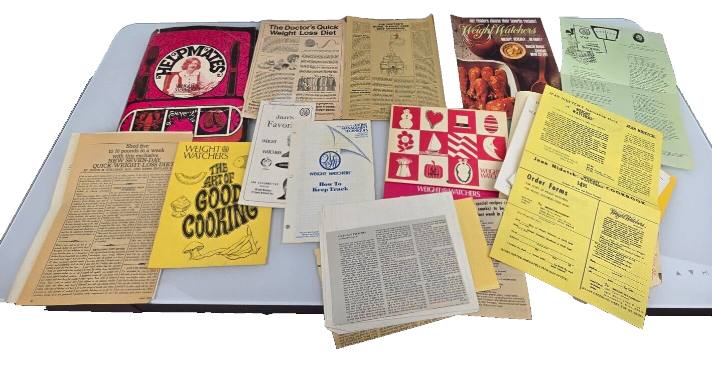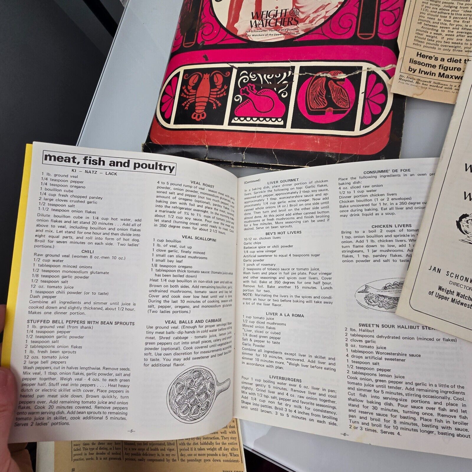 Bundle of my mom's old Weight Watchers stuff from 1971. Includes December 1971 magazine, calendar, recipes and some weight loss clippings from other magazines from around that time. Good used condition.