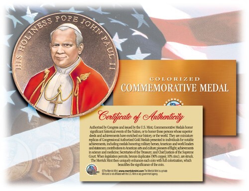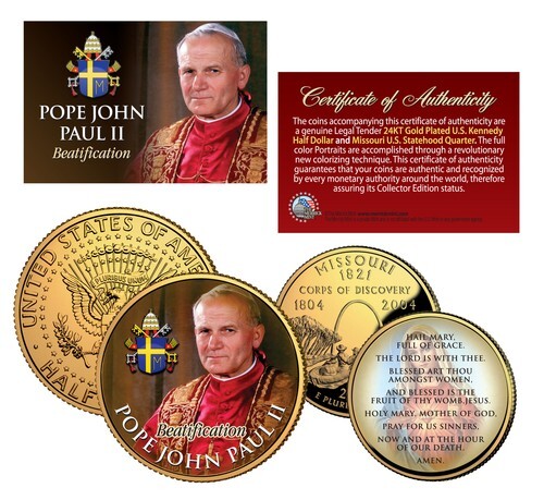 Popes John XXIII and John Paul II were declared saints on April 27, 2014, the first-ever double papal canonization. Here is your opportunity to own or to gift the ?HISTORIC DUO CANONIZATION ? APRIL 27, 2014 ? POPE JOHN XXIII POPE JOHN PAUL II ? SAINTS? colorized 2014 JFK Kennedy Half Dollar U.S. Coin, which has been enhanced with a beautifully colorized images on both sides of the coin by the Merrick Mint. Each coin comes in a premium coin capsule with a full color Certificate of Authenticity. This Legal Tender United States coin has been colorized with an application of special inks directly to the surface of the coin, using a unique and painstakingly multicolor coin process, which achieves a level of detail, color saturation, and durability that is #1 in the coin industry. The result is an everlasting colorized coin collectible of ultra-high quality. The 2014 Kennedy half dollar is a U.S. fifty cent coin with coin mint marks chosen at random.