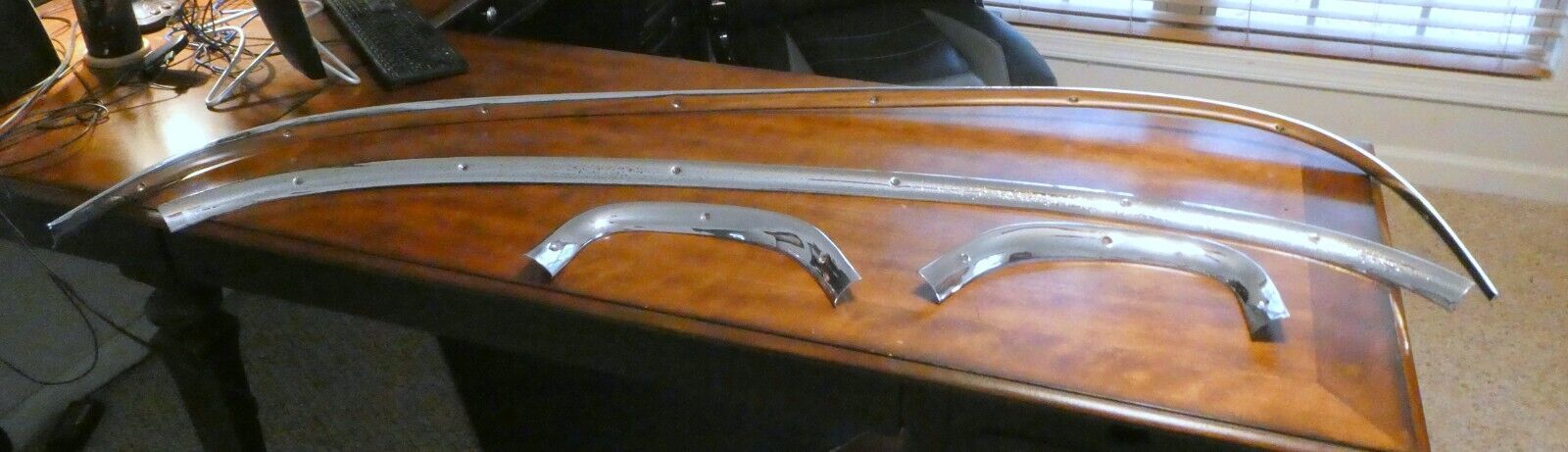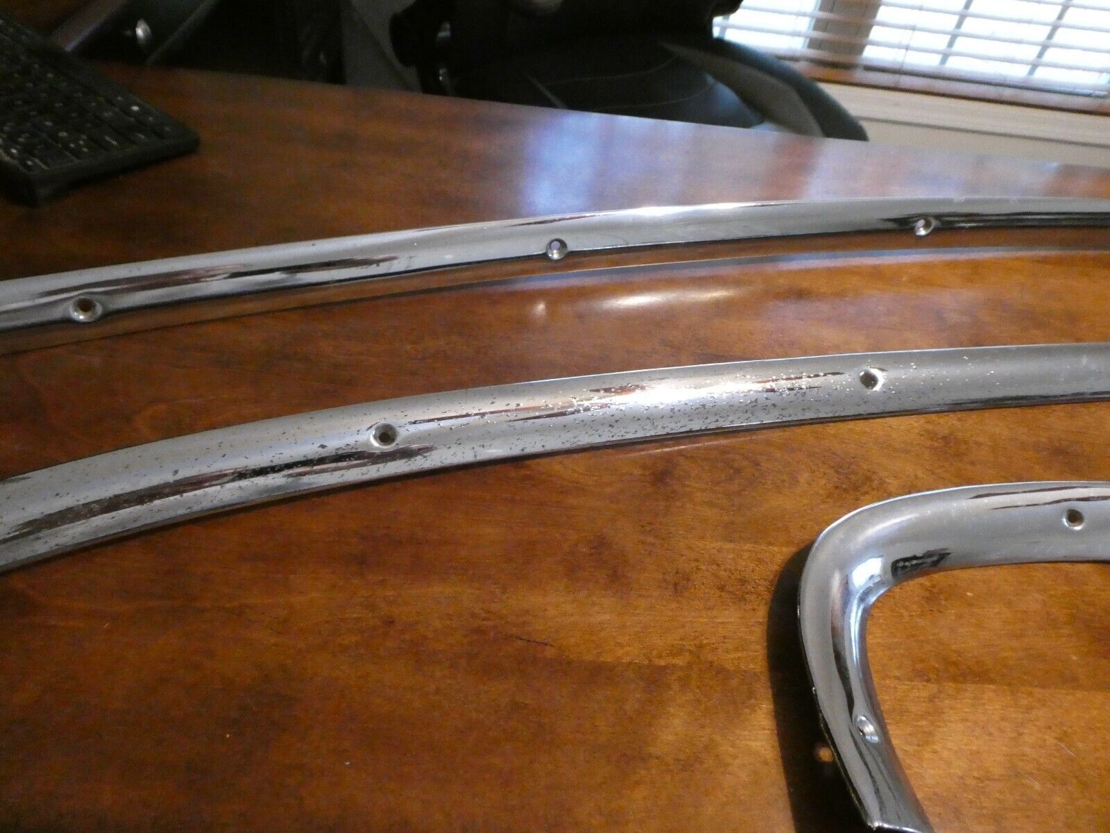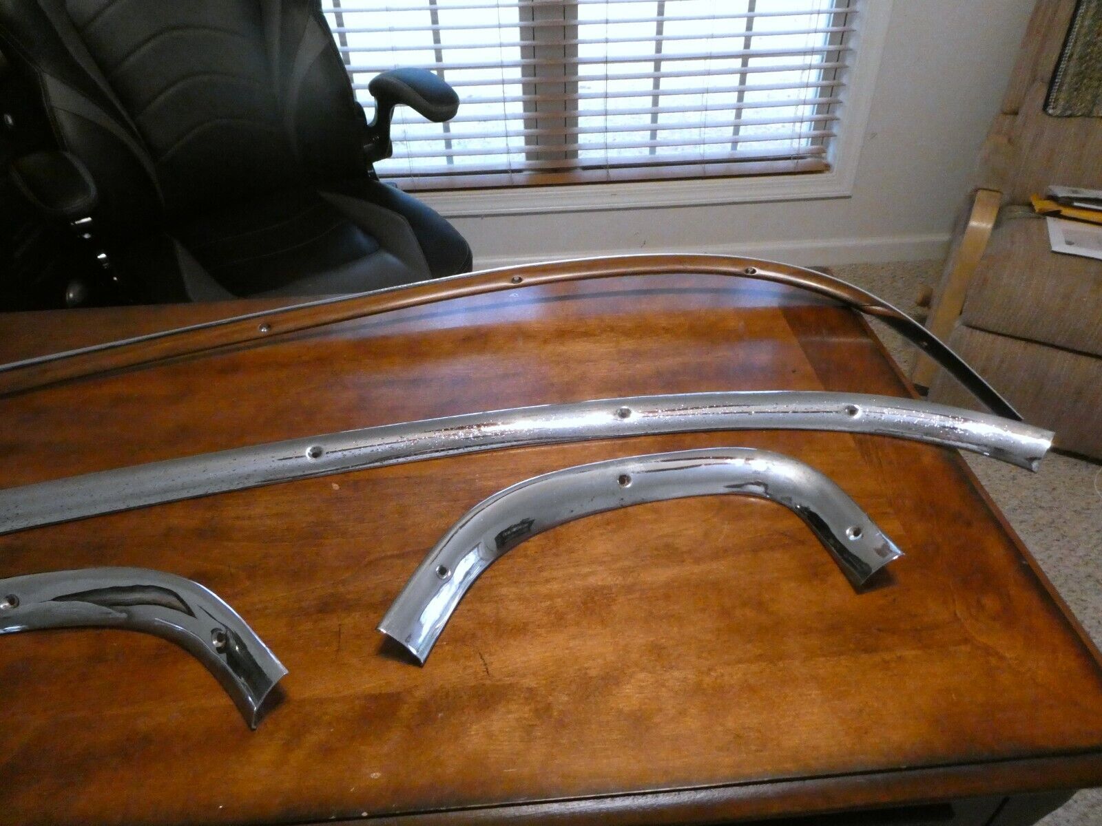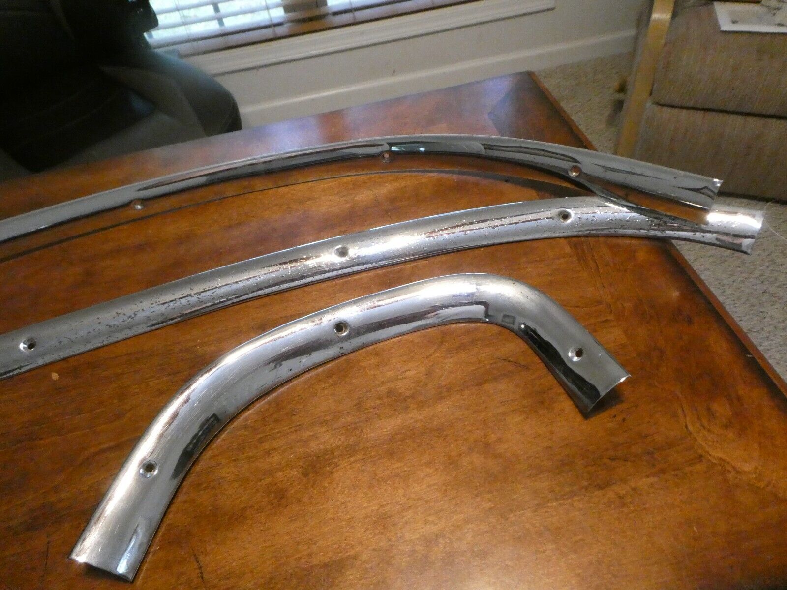 Full 4 piece set of 1955-1956 Chrysler Imperial Interior Rear Window Trim. Removed from a 1956 Chrysler Imperial 4 door sedan. NO dents, dings or damage. There is some pitting of the chrome as shown in pictures. Items I sell May have minor scratches / scuffs / dings / dents / cracks / rust or paint loss !!!!