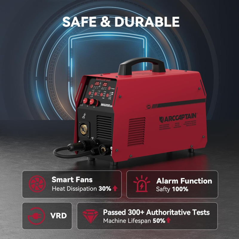 SAFETY PROTECTION: Every single of our welder machines passed various authoritative Laboratory tests in simulating extremely harsh environments before leaving our ARCCAPTAIN factory that conforms to the high standards. We take care of our customer?s safety based on VRD, over current/over voltage/over current/over-load/overheating protection function. Note: DO NOT power on until the screen turns off and the fan stops working