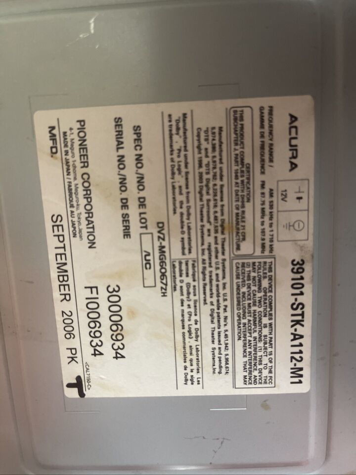 Acura RDX 07-09 Radio XM AM/FM MP3 WMA AUDIO DVD 39101-STK-A112 -M1 AC109U