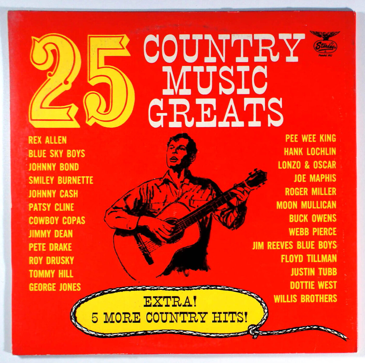 25 Country Music Greats is a collection of hits from artists such as Buck Owens, George Jones, Dottie West, Patsy Cline, Rex Allen, and Jimmy Dean among others.