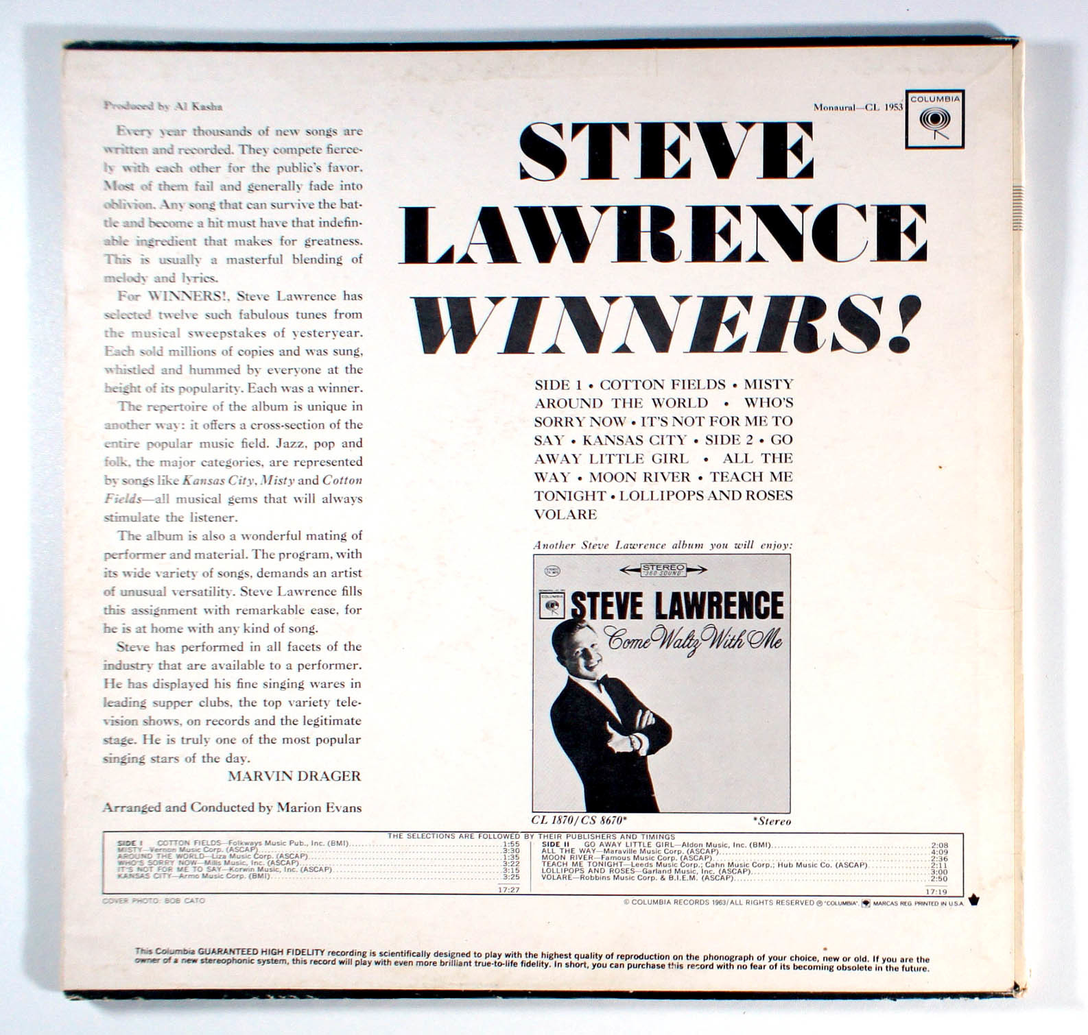 For Winners!,, "Steve Lawrence Has selected twelve fabulous tunes from the musical sweepstakes of yesteryear. Each sold millions of copies and was sung, whistled and hummed by everyone at the height of its popularity. Each was a winner." (liner notes). The "winners" require a voice that is adaptable to a variety of songs and demands versatility. Steve Lawrence fits both because he is at home with any kind of song.