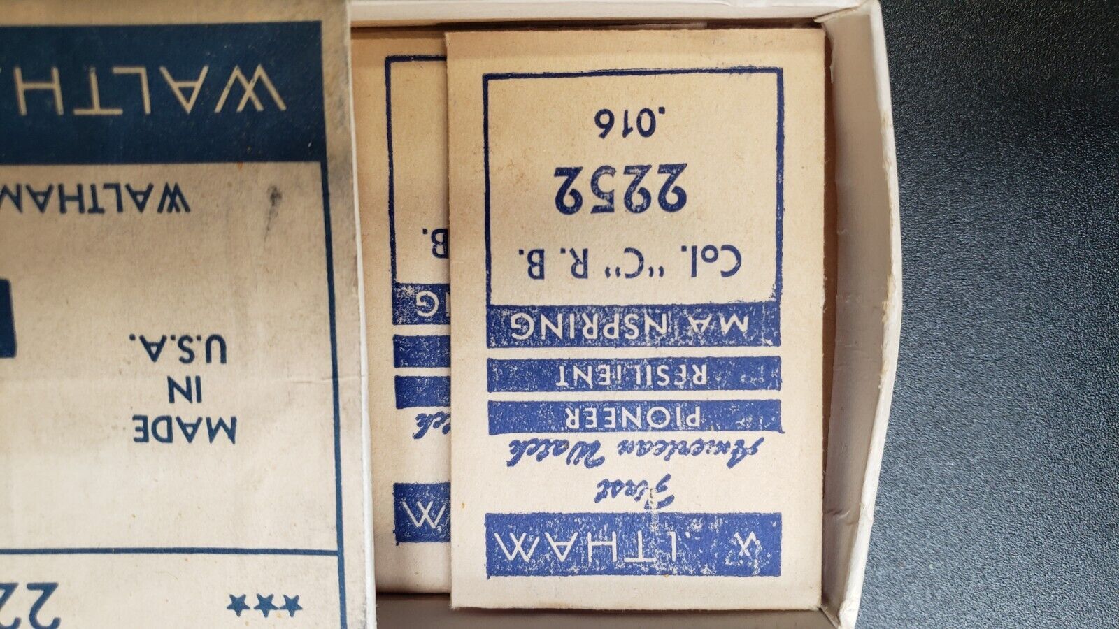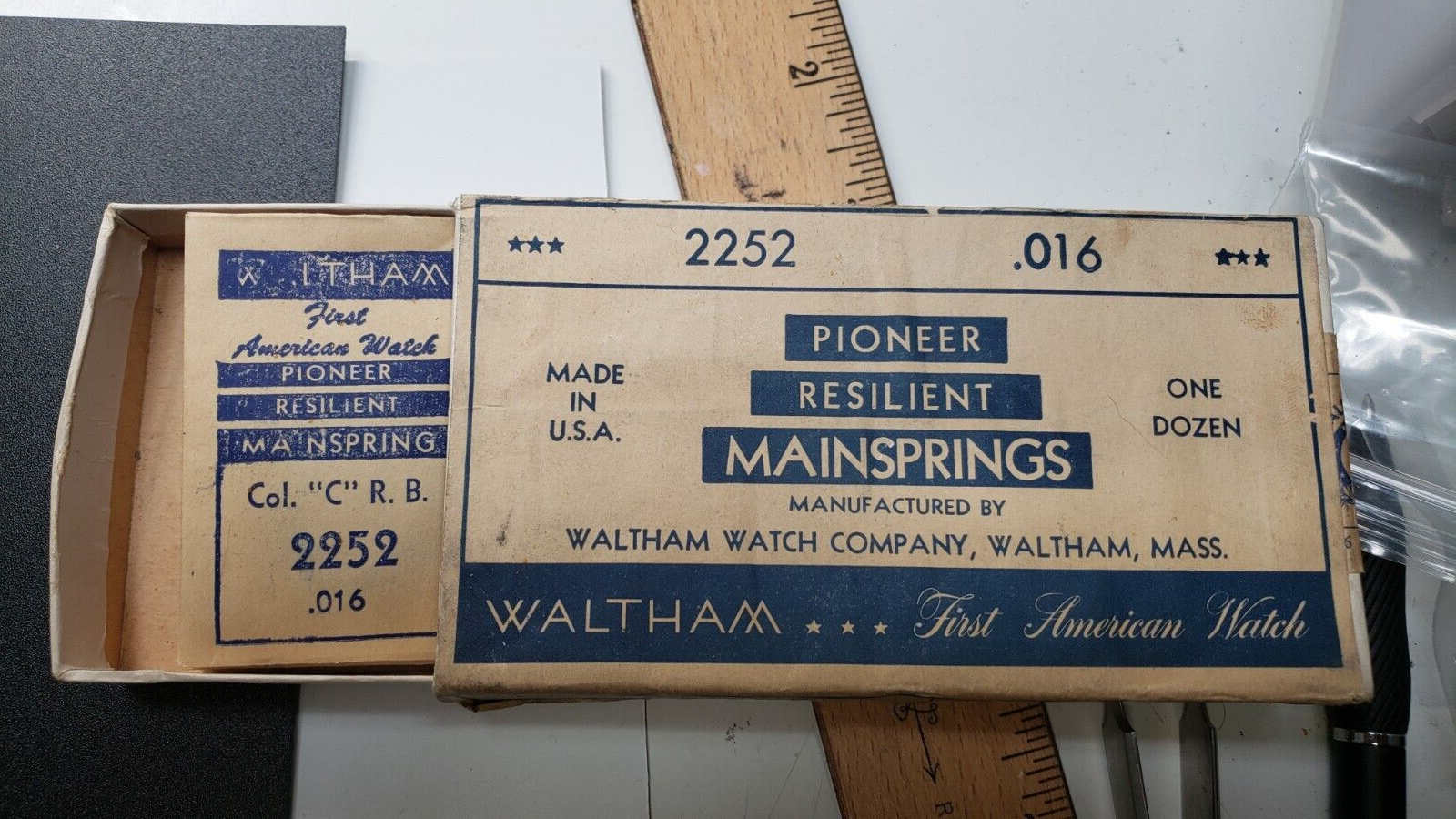 Nouveau cas Waltham Pioneer Resilient Mainspring Watch Box w / 12 enveloppes 2252 .16 - Je ne suis pas un expert. Si vous savez quelque chose de plus sur cette montre, faites-le moi savoir .....? Il y a 12 enveloppes avec les principauxprings. Tous nouveaux Ceci est un morceau d'histoire. Si vous reparez les vieilles montres, vous avez de la chance. Je ne suis pas un expert des montres. J'ai achete beaucoup d'anciennes pieces de montres dans une entreprise de reparation de surveillance familiale qui est allee aux encheres. Ils etaient en affaires depuis 100 ans. S'il vous plaît - consultez mes autres pieces de montre vintage que nous enumerons davantage au cours du prochain nombre de mois. Je vais vous donner un accord si vous voulez plusieurs commandes !! Navire americain gratui